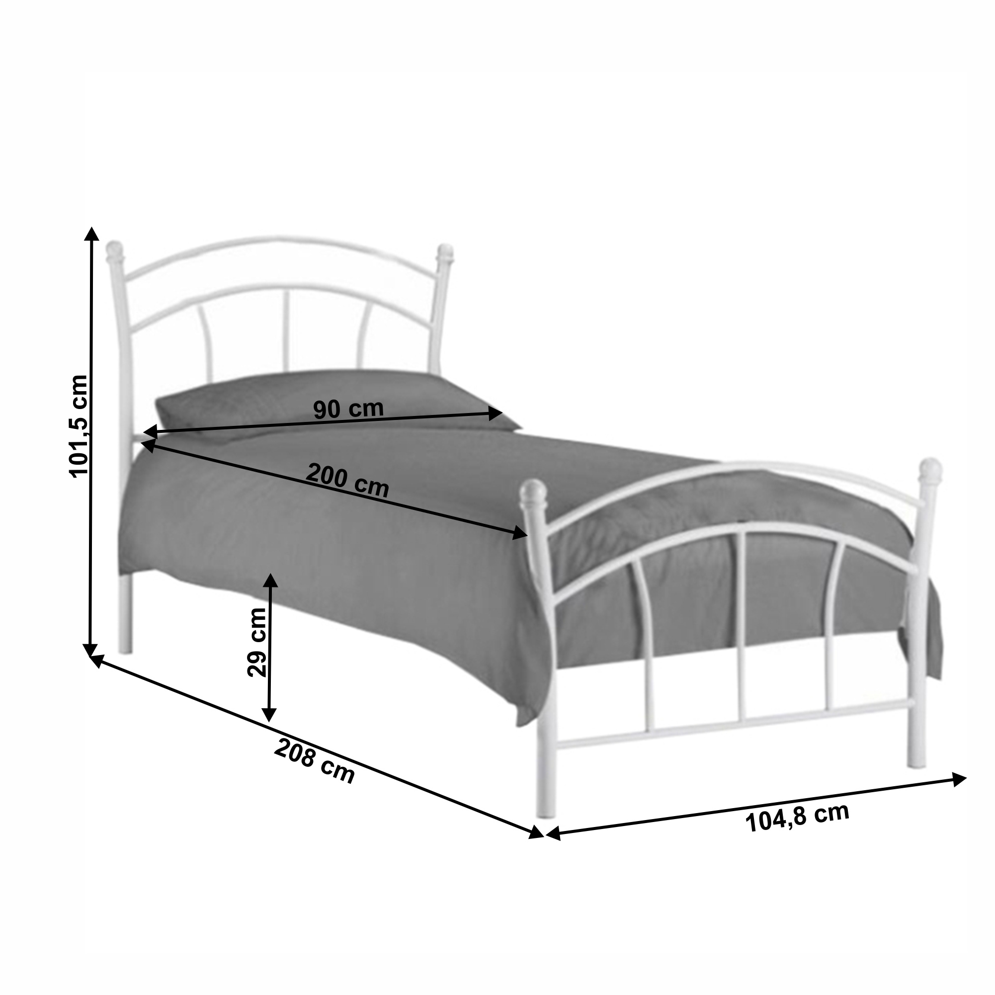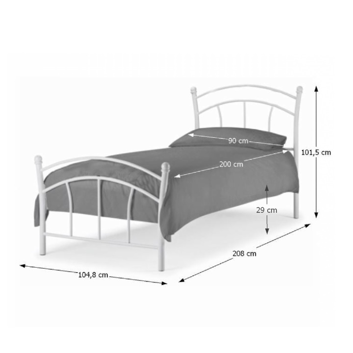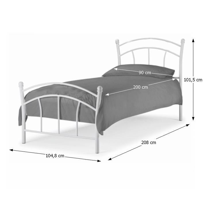 Kovová postel BURZUM s roštem Materiál: kov Barva: bílá Rozměry (ŠxHxV): 104,8x280x101,5 cm Plocha na spaní (ŠxD): 90x200 cm Nosnost: 100 kg Výška po rošt: 29 cm S lamelovým roštem Bez matrace Možnost dokoupit matraci Rustikální styl Dodáváno v demontu Možnost dokoupení matrace o rozměru 90x200 cm z naší nabídky.
