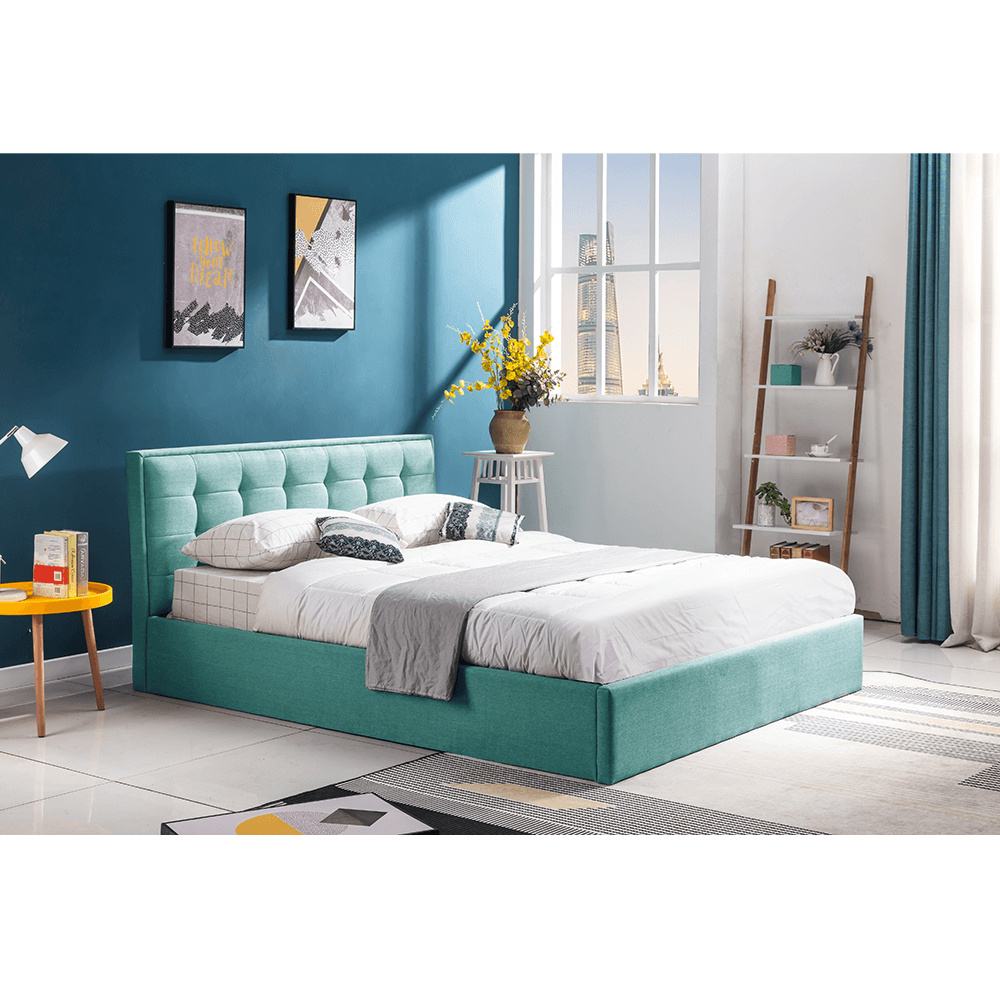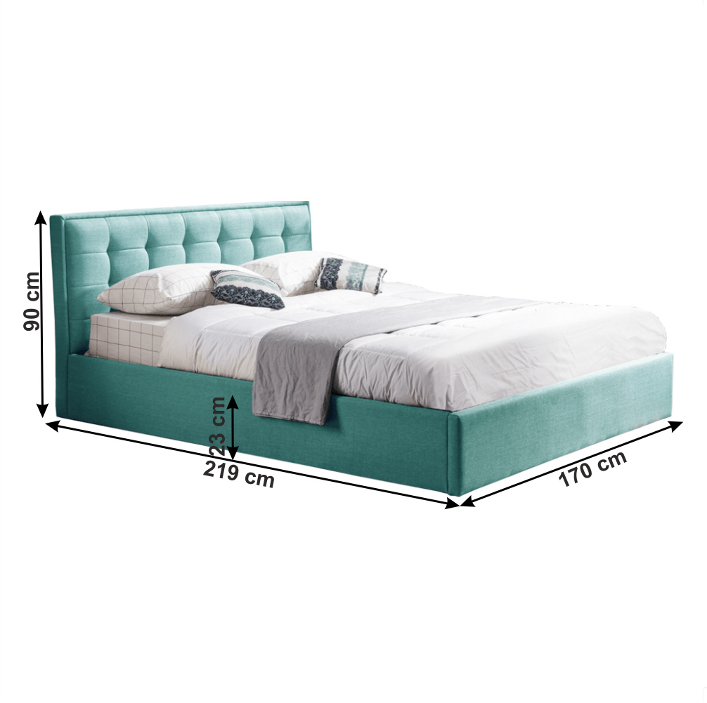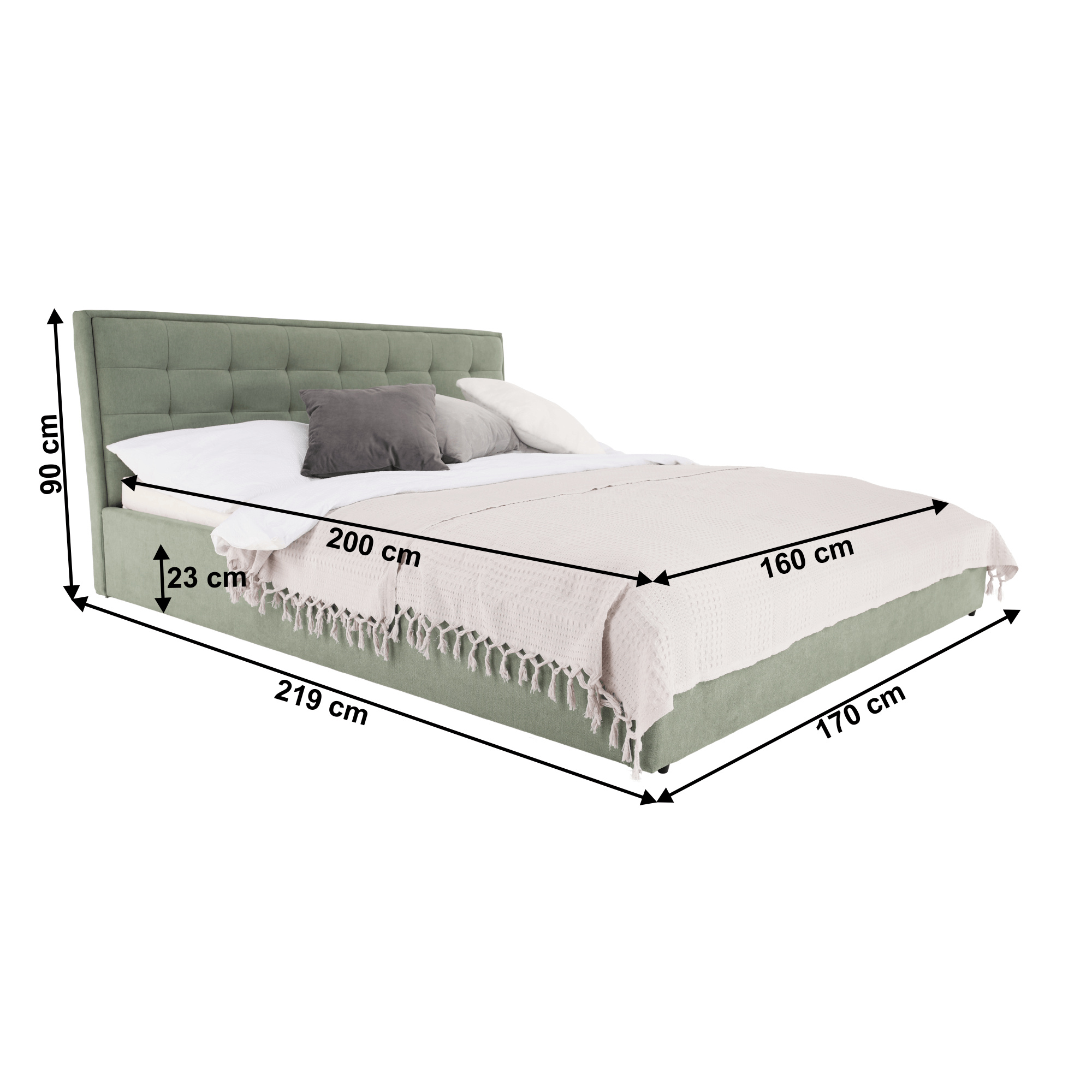 Materiál: látka Oděruodolnost textilie podle testu Martindale: 100 000 oděrek Barva: mentolová Rozměry (ŠxHxV): 170x219x90 cm Plocha na spaní (ŠxH): 160x200 cm Výška po rošt: 23 cm Zapuštění roštu: 4 cm Dodávané s lamelovým roštem Nosnost na jedno lůžko: 110 kg úložný prostor prošívané čelo Dodávané bez matrace Možnost zakoupit matrace z naší nabídky Dodávané v demontu
