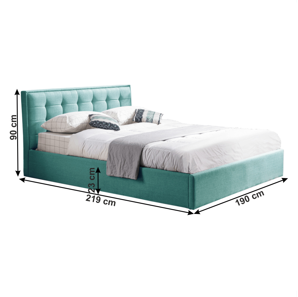 Materiál: látka Oděruodolnost textilie podle testu Martindale: 100 000 oděrek Barva: mentolová Rozměry (ŠxHxV): 190x219x90 cm Plocha na spaní (ŠxH): 180x200 cm Výška po rošt: 23 cm Zapuštění roštu: 4 cm Dodávané s lamelovým roštem Nosnost na jedno lůžko: 110 kg úložný prostor prošívané čelo Dodávané bez matrace Možnost zakoupit matrace z naší nabídky Dodávané v demontu