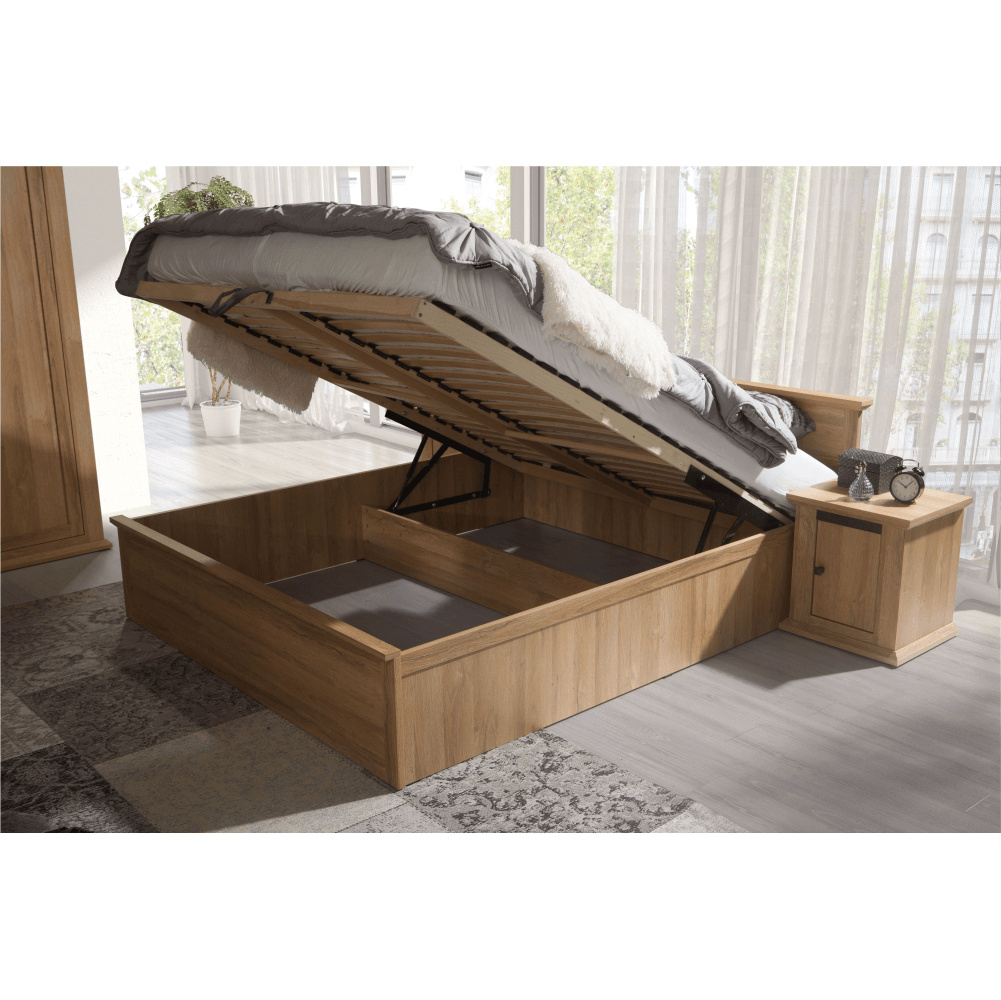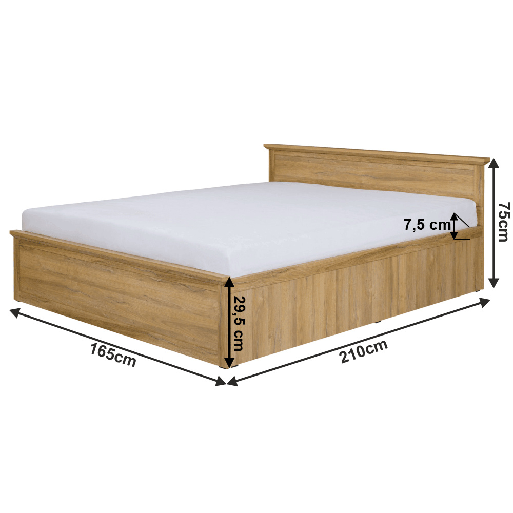 Materiál: DTD laminovaná / ABS hrany Barva: dub grand Rozměry (ŠxHxV): 165x210x75 cm Plocha na spaní (ŠxD): 160x200 cm Výška po rošt: 29,5 cm Zapuštění roštu: 7,5 cm Tloušťka materiálu: 40 mm Nosnost: 120 kg S úložným prostorem S výklopným roštem Bez matrace Doporučujeme zakoupit matraci s maximální výškou 19 cm. Elegantní V provensálském stylu Dodávané v demontu