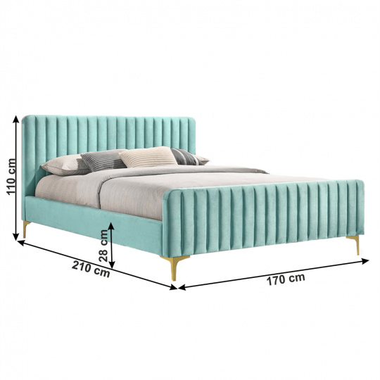 Materiál čalounění: Velvet látka Oděruodolnost textilie podle testu Martindale: 80 000 oděrek Barva čalounění: neo mint Materiál nohy: kov chrom Barva nohy: gold zlatý matný Rozměry (ŠxHxV): 170x217x110 cm Plocha na spaní (ŠxH): 160x200 cm Výška nožiček: 12,5 cm Výška po rošt: 28 cm Dodávané s lamelovým roštem Nosnost na jedno lůžko: 110 kg kovové nohy Dekorativní prošívané čela Dodávané bez matrace Možnost zakoupit matrace z naší nabídky K posteli je třeba zakoupit matraci min. s výškou 20 cm Dodávané v demontu