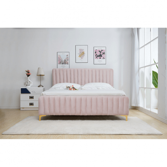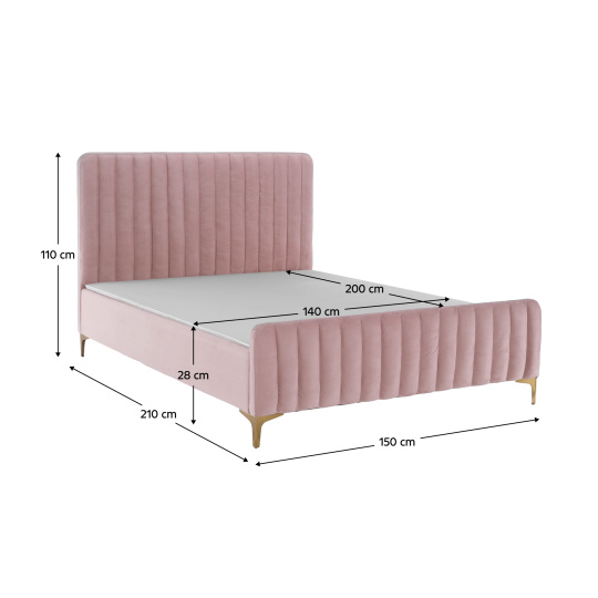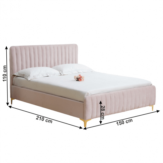 Materiál čalounění: Velvet látka Oděruodolnost textilie podle testu Martindale: 80 000 oděrek Barva čalounění: růžová Materiál nohy: kov chrom Barva nohy: gold zlatý matný Rozměry (ŠxHxV): 150x217x110 cm Plocha na spaní (ŠxH): 140x200 cm Výška nožiček: 12,5 cm Výška po rošt: 28 cm Dodávané s lamelovým roštem Nosnost na jedno lůžko: 110 kg kovové nohy Dekorativní prošívané čela Dodávané bez matrace Možnost zakoupit matrace z naší nabídky K posteli je třeba zakoupit matraci min. s výškou 20 cm Dodávané v demontu