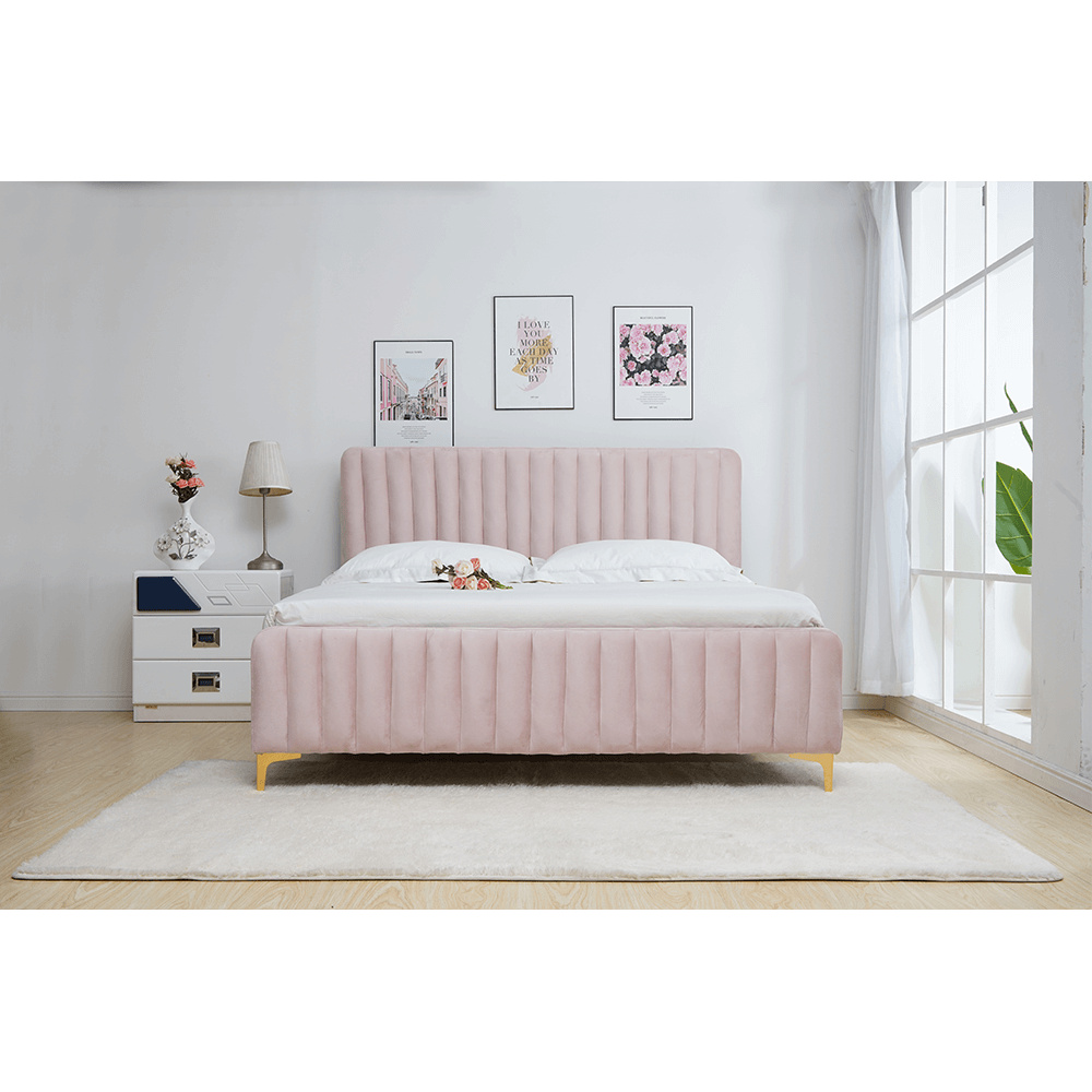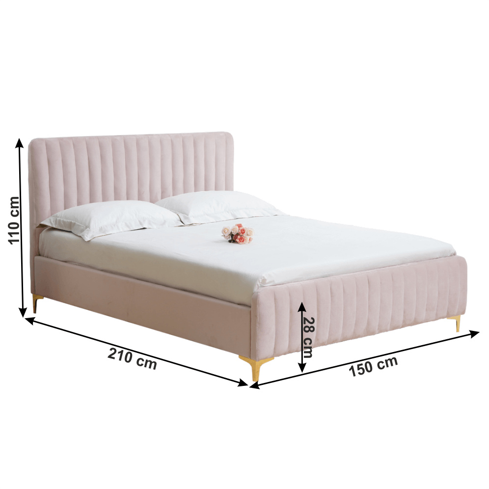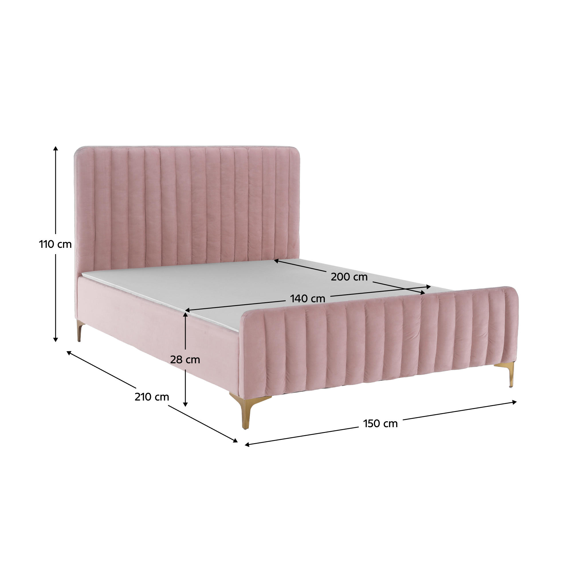 Materiál čalounění: Velvet látka Oděruodolnost textilie podle testu Martindale: 80 000 oděrek Barva čalounění: růžová Materiál nohy: kov chrom Barva nohy: gold zlatý Rozměry (ŠxHxV): 150x217x110 cm Plocha na spaní (ŠxH): 140x200 cm Výška nožiček: 12,5 cm Výška po rošt: 28 cm Dodávané s lamelovým roštem Nosnost na jedno lůžko: 110 kg kovové nohy Dekorativní prošívané čela Dodávané bez matrace Možnost zakoupit matrace z naší nabídky K posteli je třeba zakoupit matraci min. s výškou 20 cm Dodávané v demontu