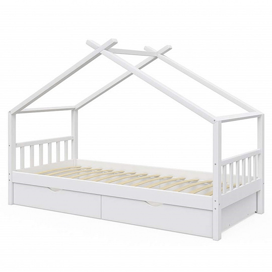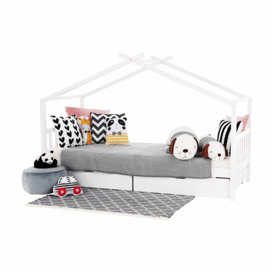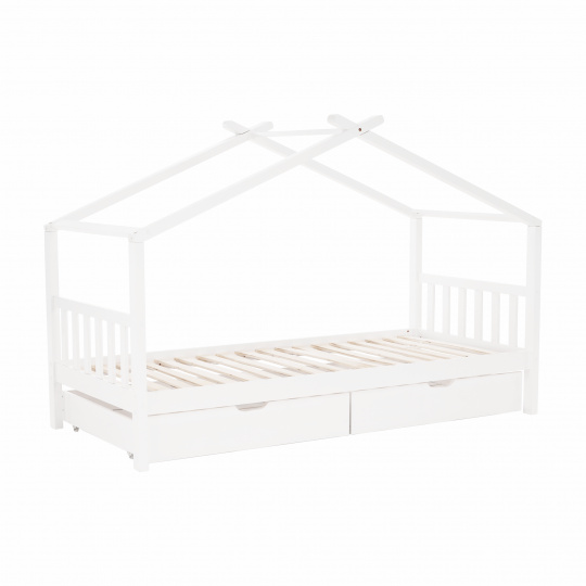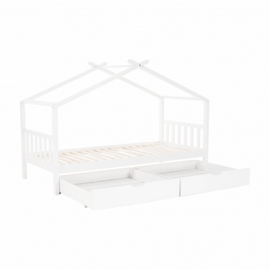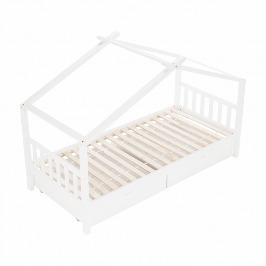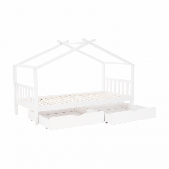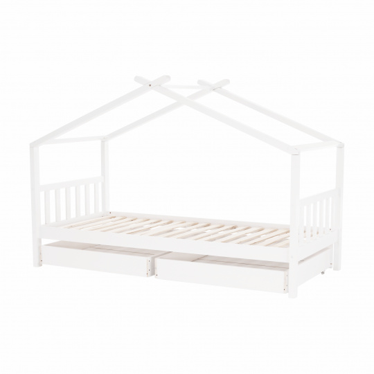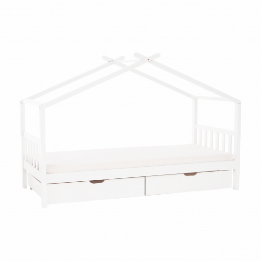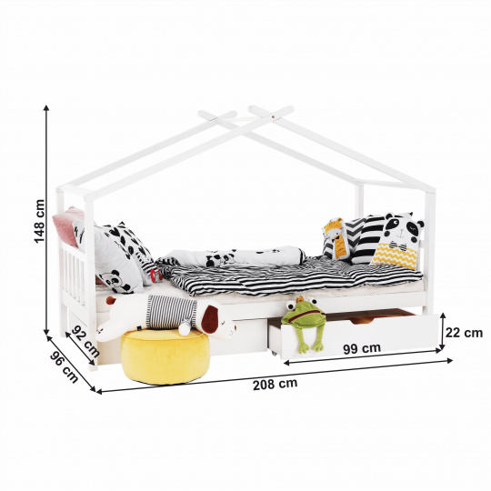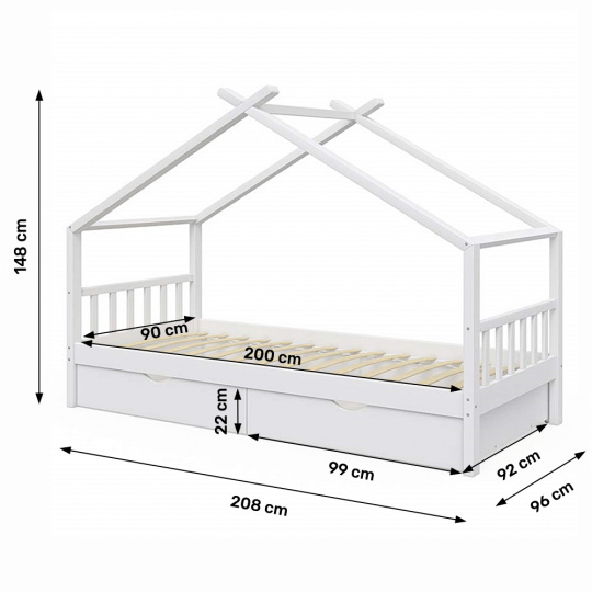 Materiál: borovicový masiv / překližka (rošt) Barva: bílá Rozměry (ŠxHxV): 208x96x148 cm Rozměry lůžka (ŠxH): 90x200 cm Dodávaná s zarolovaným roštem Výška po rošt: 27,5 cm Kontejner (ŠxHxV): 99x92x22 cm Nosnost: max. 90 kg S úložným prostorem 2 zásuvné kontejneru Dodávané bez matrace Možnost zakoupit matrace z naší nabídky Dodávané v demontu