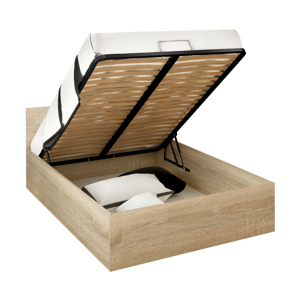 Postel s kovovým roštem a úložným prostorem, 140x200, dub sonoma, DOLI