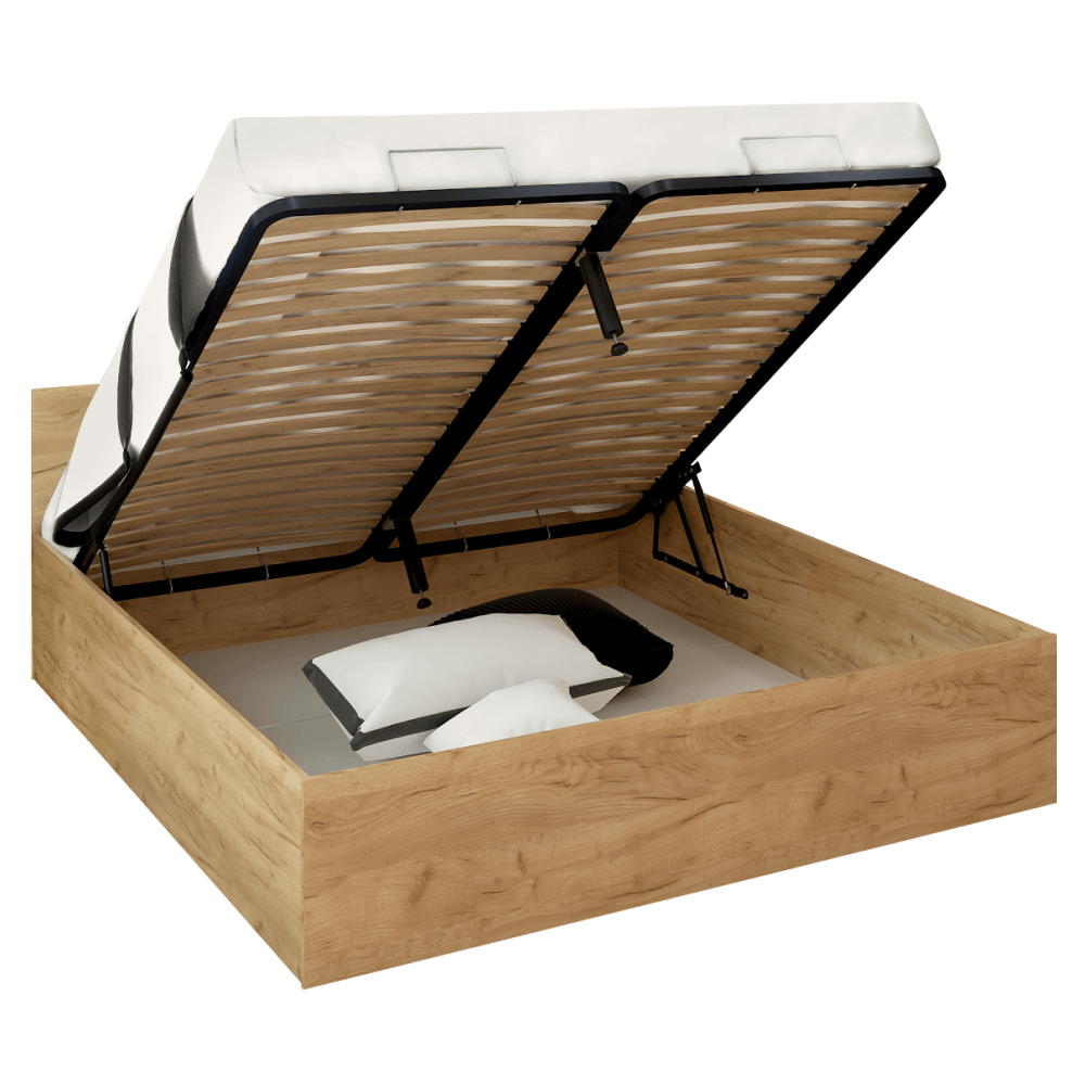 Materiál: laminovaná DTD Barva: dub sonoma Rozměry (ŠxHxV): 183,6x203,2x78,7 cm Rozměry plocha na spaní (ŠxD): 180x200 cm Tloušťka laminované DTD: 1,6 cm Výška po rošt: 24,1 cm Výška bočnice: 39,9 cm Doporučená minimální výška matrace: 10 cm S úložným prostorem Výška otevřené postele: 141 cm Nosnost na osobu: 90 kg Dodáváno s kovovým roštem Rošt je dodáván v montě Dodáváno bez matrace Možnost zakoupit matraci z naší nabídky Moderní design Kvalitní slovenský výrobek Dodáváno v demontu