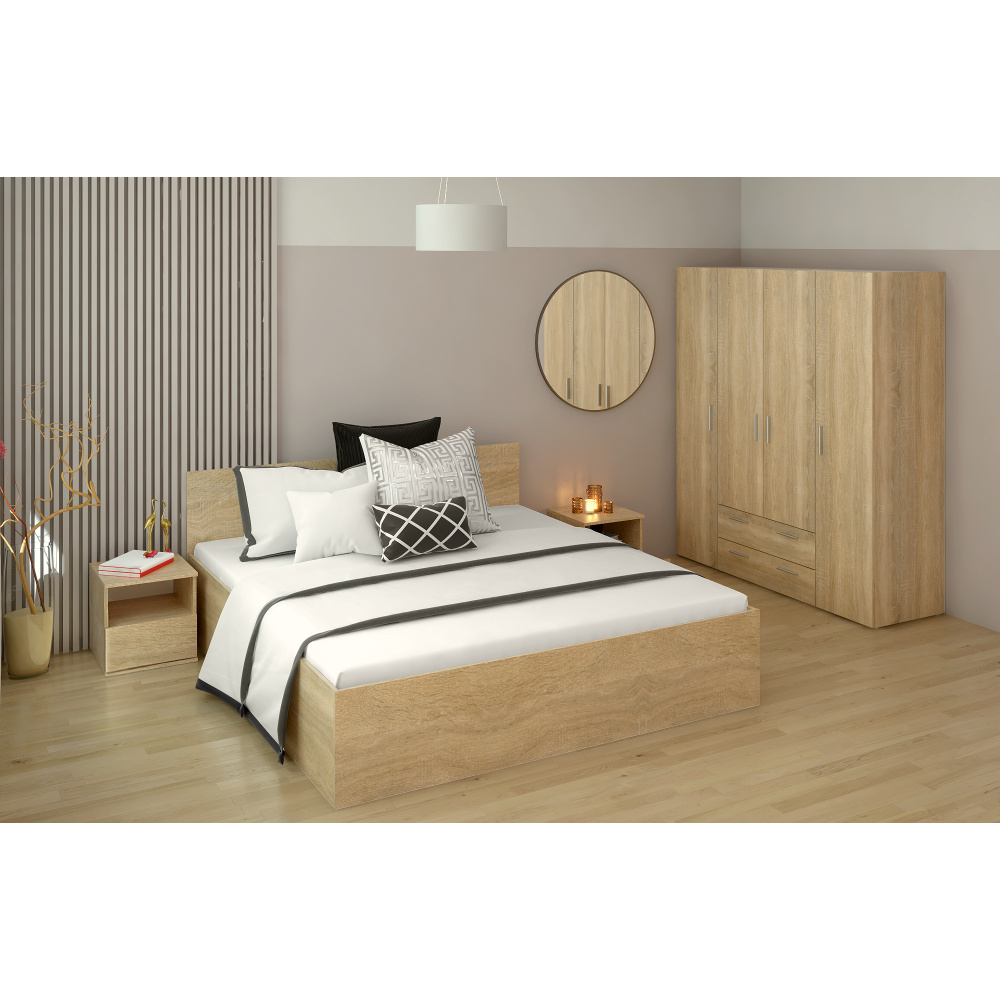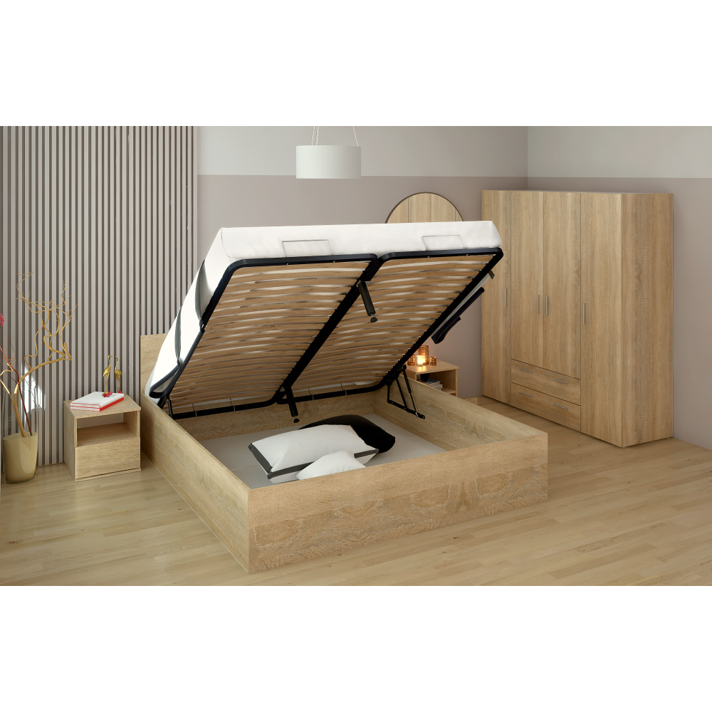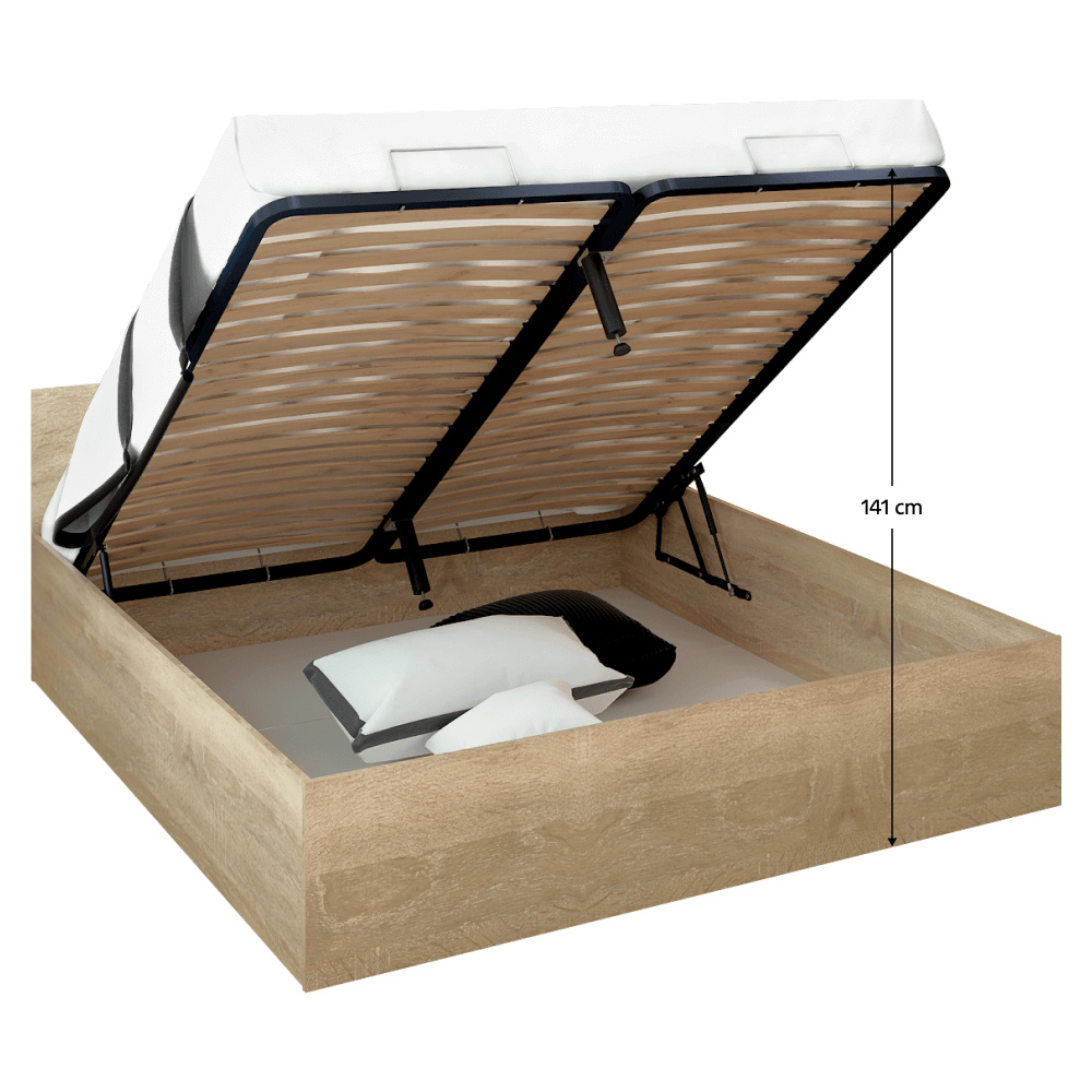 Materiál: laminovaná DTD Barva: dub sonoma Rozměry (ŠxHxV): 183,6x203,2x78,7 cm Rozměry plocha na spaní (ŠxD): 180x200 cm Tloušťka laminované DTD: 1,6 cm Výška po rošt: 24,1 cm Výška bočnice: 39,9 cm Doporučená minimální výška matrace: 10 cm S úložným prostorem Výška otevřené postele: 141 cm Nosnost na osobu: 90 kg Dodáváno s kovovým roštem Rošt je dodáván v montě Dodáváno bez matrace Možnost zakoupit matraci z naší nabídky Moderní design Kvalitní slovenský výrobek Dodáváno v demontu
