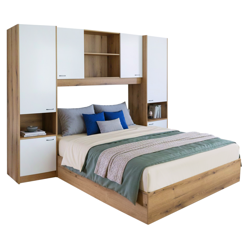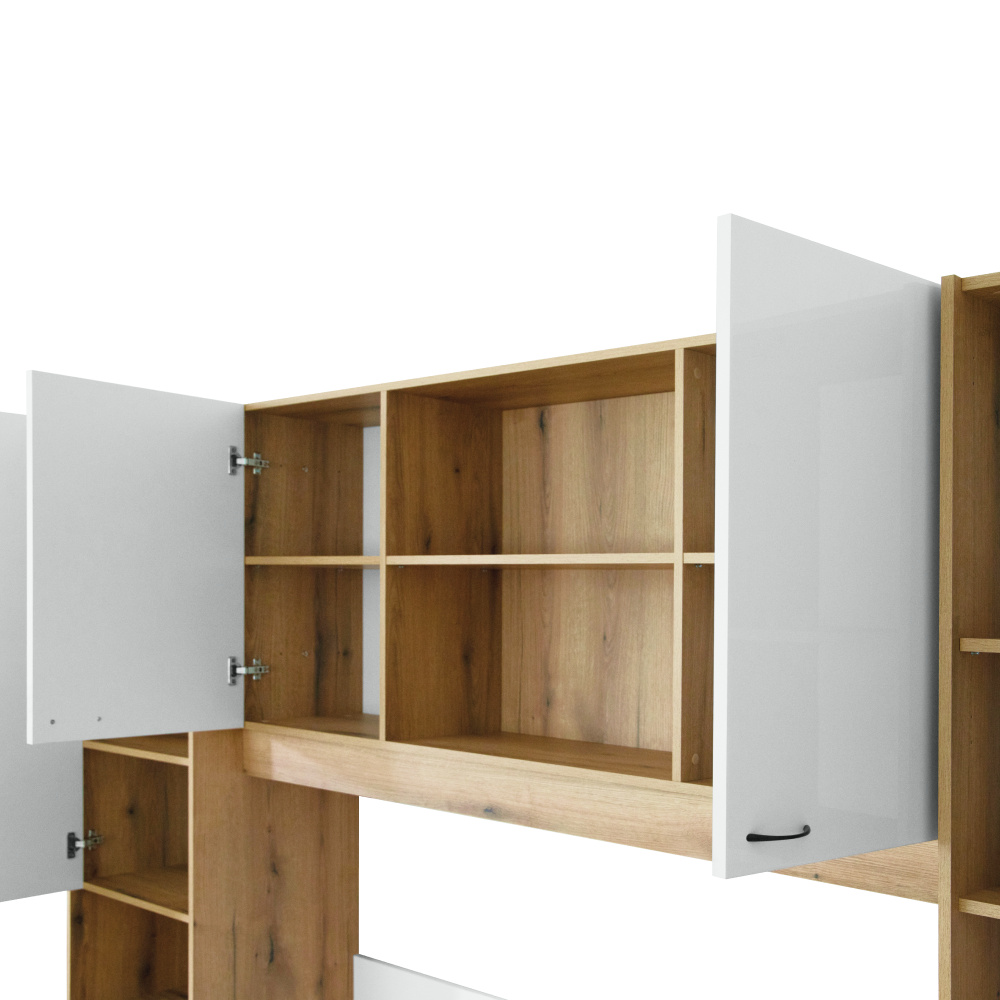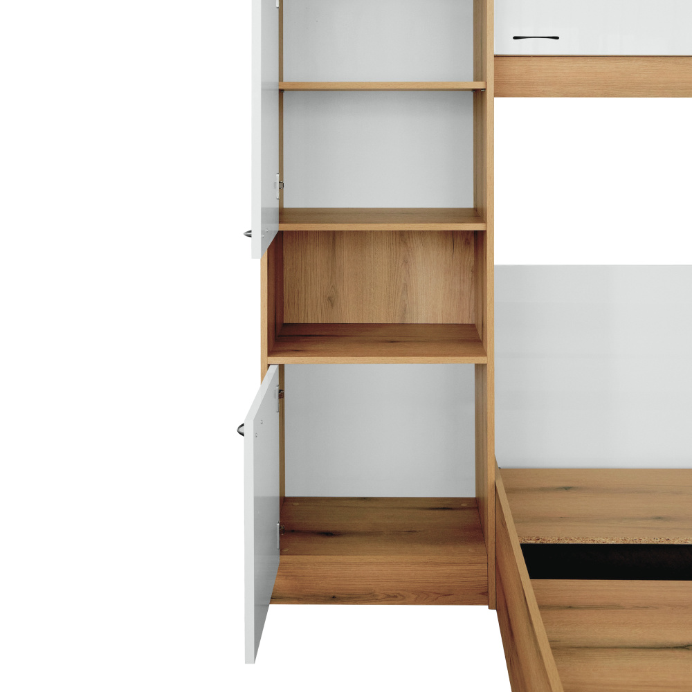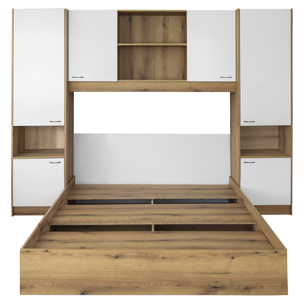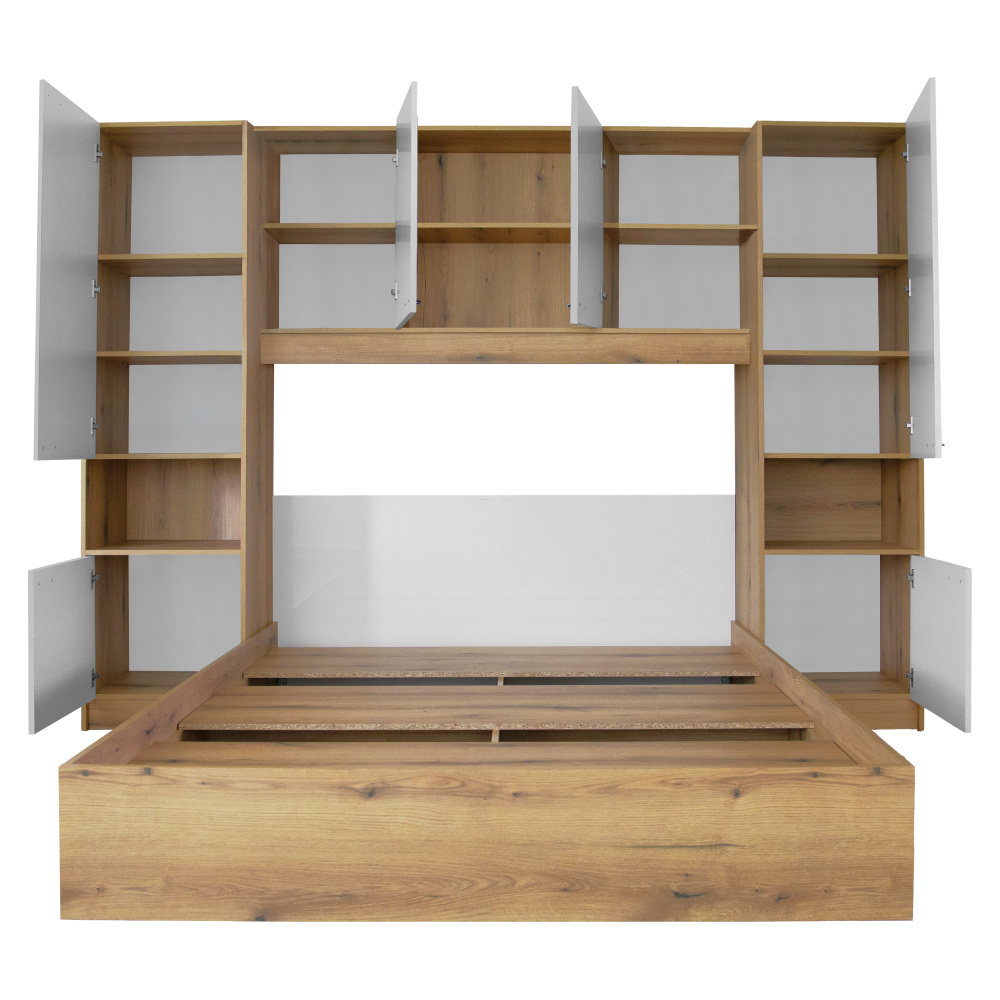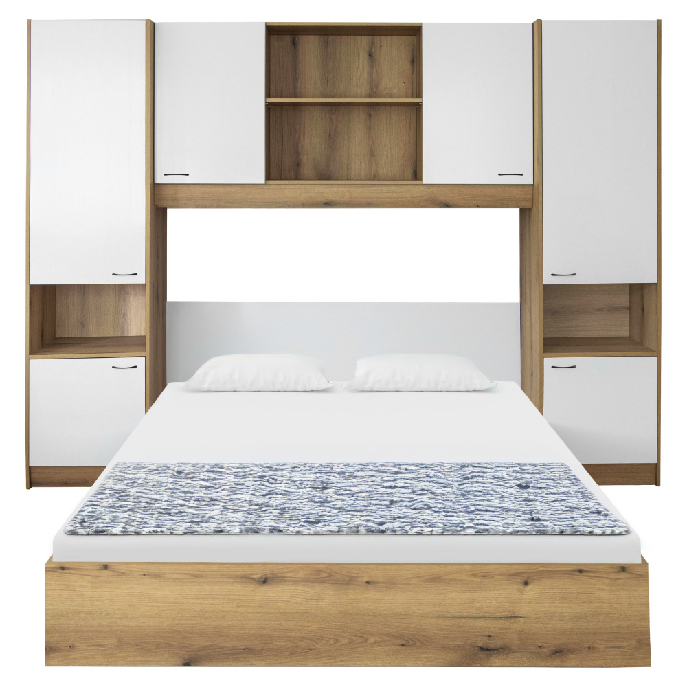 Materiál: laminovaná DTD Barva: dub/bílá vysoký lesk HG Rozměry (ŠxHxV): 273x204,5x200,5 cm Tloušťka materiálu korpus: 1,6 cm Tloušťka materiálu dvířka: 1,8 cm Postel Rozměry postel (ŠxHxV): 164x204,5x75 cm Plocha na spaní (ŠxH): 160x200 cm Dodávána s roštem 3 roštové desky Výška po rošt: 22 cm Prostor mezi roštovými deskami: 12,5 cm Dodáváno bez matrace Možnost dokoupit matraci z naší nabídky Doporučená minimální výška matrace: 20 cm Nosnost na osobu: 100 kg Nádstavec Rozměry nástavec (ŠxHxV): 273x44,5x200,5 cm Úložný prostor S dvířky Policový Nosnost police: Max. 10 kg Otevřený úložný prostor Otevřený úložný prostor vhodný i jako noční stolek S úchyty Materiál úchytek: kov Barva úchytek: černá Doporučujeme připevnit ke stěně Praktické Moderní design Dodáváno v demontu