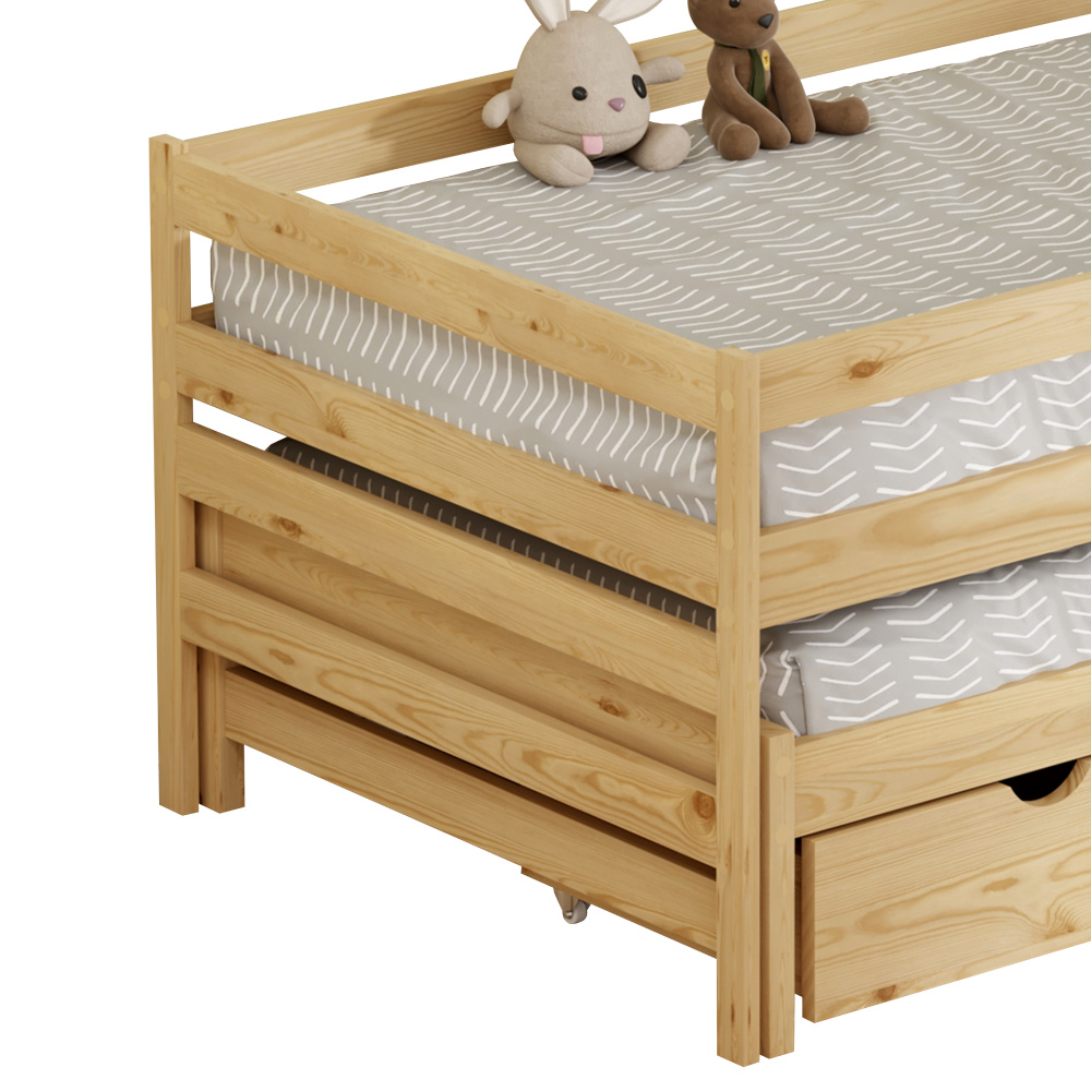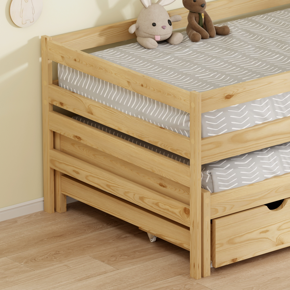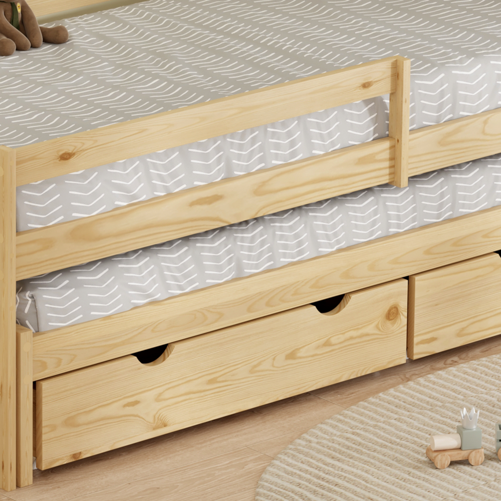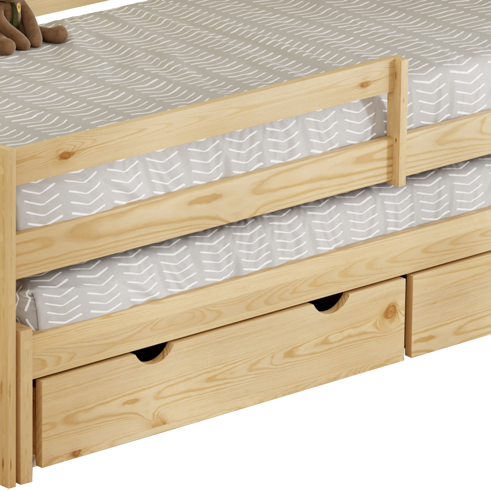 Materiál: borové dřevo/překližka Barva: přírodní Rozměry (ŠxHxV): 96x213x69 cm Plocha na spaní (ŠxD): 90x200 cm S přistýlkou Rozměry přistýlky (ŠxHxV): 96x213x31 cm Rozměr matrace na přistýlku: 90x200 cm Nosnost na lůžko: 90 kg Nosnost na přistýlku: 90 kg Na nožičkách S úložným prostorem Dva šuplíky na kolečkách Rozměr šuplíku (ŠxHxV): 99x49x20,5 cm Nosnost šuplíku: 35 kg S bezpečnostní bariérou Možnost namontovat zábranu na levou nebo pravou stranu Dodávána bez matrace Možnost zakoupit matraci z naší nabídky Doporučená minimální výška matrace na lůžko: 7 cm Zapuštění matrace: 3 cm Doporučená výška matrace na přistýlku: 7-10 cm Dodávána s překližkovými rošty Použité barvy a laky splňují všechny stanovené normy a nezávadnosti Dodáváno v demontu Doporučení pro údržbu: - ošetřujte vlhčeným hadříkem - používejte pouze mýdlo PH neutrální - nevystavujte přímému slunečnímu záření