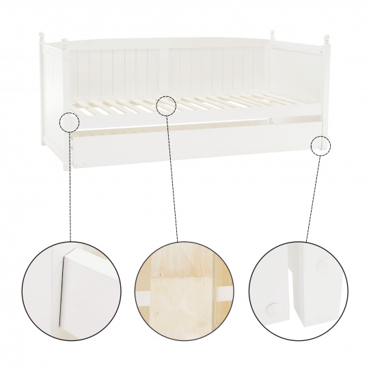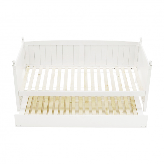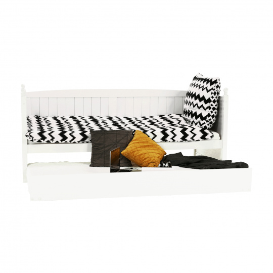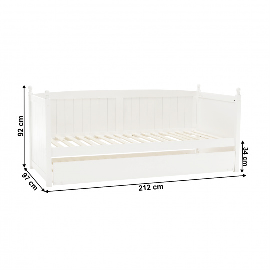 Postel s přistýlkou GLAMIS Materiál: borovicové dřevo / MDF / překližka, Barevné provedení: bílá, Rozměry (ŠxHxV): 212x97x92 cm, Plocha na spaní: 90x200 cm, Hmotnost: 51 kg, Výška po rošt přistýlka: 5 cm Výška po rošt lůžko: 34 cm Maximální výška matrace na přistýlka: 20 cm Tloušťka materiálu: 20 mm Tloušťka materiálu nohou (ŠxH): 50x50 mm Nosnost: 90 kg na jedno lůžko Rolovaný rošt, Možnost dokoupit matrace s rozměrem 90x200 cm na základě naší nabídky.
