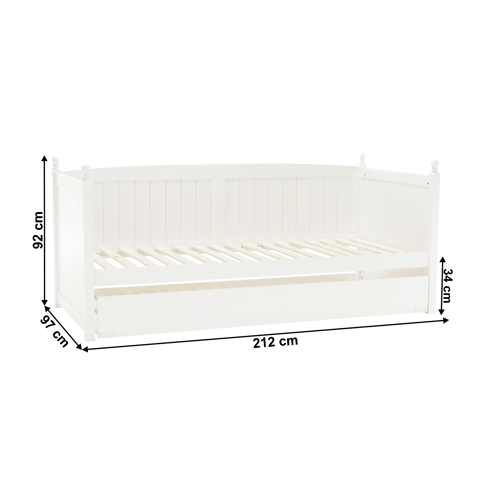 Postel s přistýlkou GLAMIS Materiál: borovicové dřevo / MDF / překližka, Barevné provedení: bílá, Rozměry (ŠxHxV): 212x97x92 cm, Plocha na spaní: 90x200 cm, Hmotnost: 51 kg, Výška po rošt přistýlka: 5 cm Výška po rošt lůžko: 34 cm Maximální výška matrace na přistýlka: 20 cm Tloušťka materiálu: 20 mm Tloušťka materiálu nohou (ŠxH): 50x50 mm Nosnost: 90 kg na jedno lůžko Rolovaný rošt, Možnost dokoupit matrace s rozměrem 90x200 cm na základě naší nabídky.