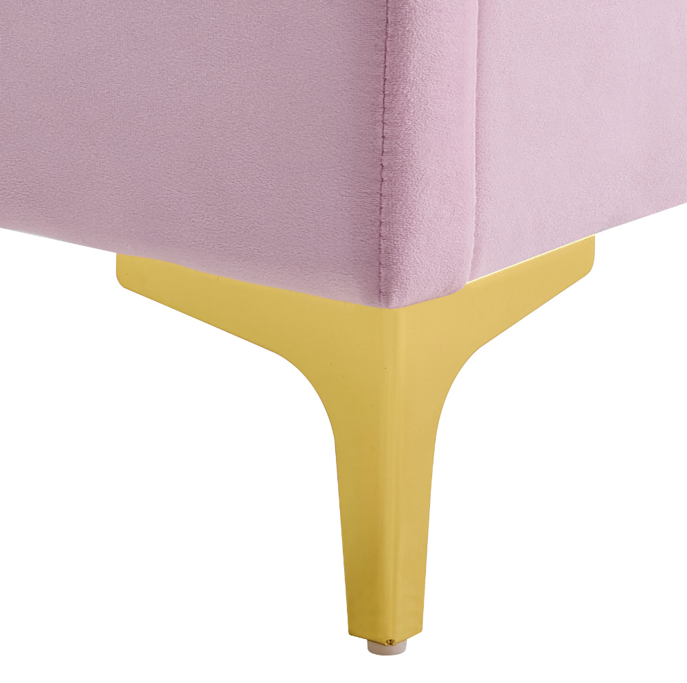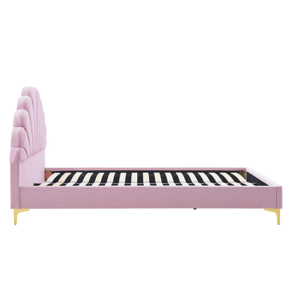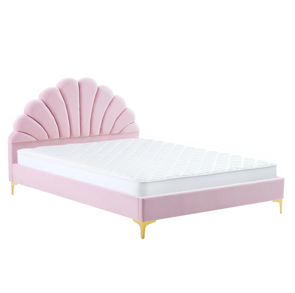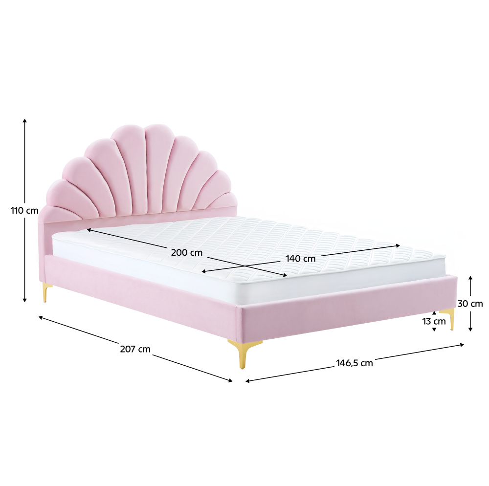 Materiál: Velvet látka/MDF/dřevotříska Oděruodolnost textilie podle testu Martindale: 25 000-30 000 oděrů Barva: růžová Rozměry (ŠxHxV): 146,5x207x110 cm Plocha na spaní (ŠxD): 140x200 cm Výška bočnice: 30 cm Výška po rošt: 27 cm Nosnost na osobu: 110 kg Dekorativní prošívané čelo ve tvaru mušle Na nožičkách Materiál nožiček: kov Barva nožiček: zlatá Výška nožiček: 13 cm Dodávána s lamelovým roštem Prostor mezi lamelami: 5,5 cm Dodávána bez matrace Doporučujeme zakoupit matraci z naší nabídky Zapuštění matrace: 3 cm Doporučená výška matrace: 20 cm Elegantní Čalouněná Dodáváno v demontu