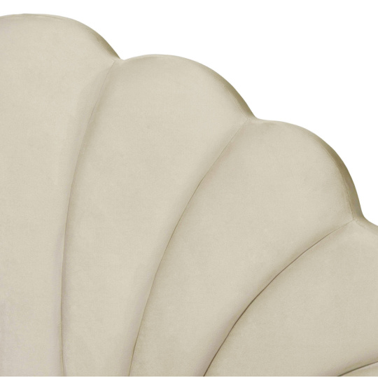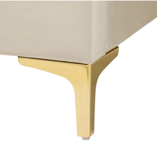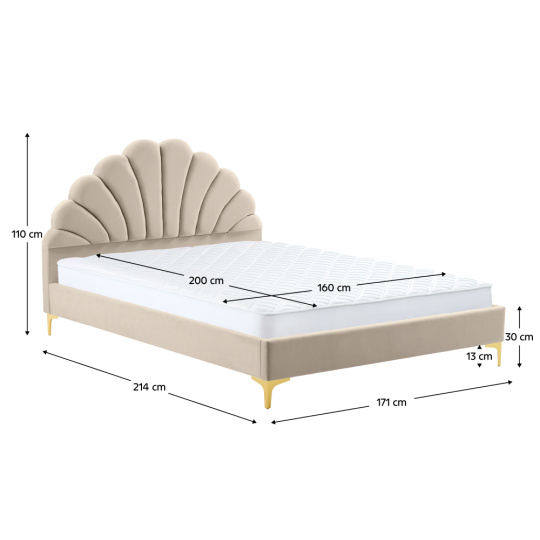 Materiál: Velvet látka/MDF/dřevotříska Oděruodolnost textilie podle testu Martindale: 25 000-30 000 oděrů Barva: béžová Rozměry (ŠxHxV): 171x214x110 cm Plocha na spaní (ŠxD): 160x200 cm Výška po rošt: 27 cm Výška bočnice: 30 cm Nosnost na osobu: 110 kg Dekorativní prošívané čelo ve tvaru mušle Na nožičkách Materiál nožiček: kov Barva nožiček: zlatá Výška nožiček: 13 cm Dodávána s lamelovým roštem Prostor mezi lamelami: 5,5 cm Dodávána bez matrace Doporučujeme zakoupit matraci z naší nabídky Zapuštění matrace: 3 cm Doporučená výška matrace: 20 cm Elegantní Čalouněná Dodáváno v demontu