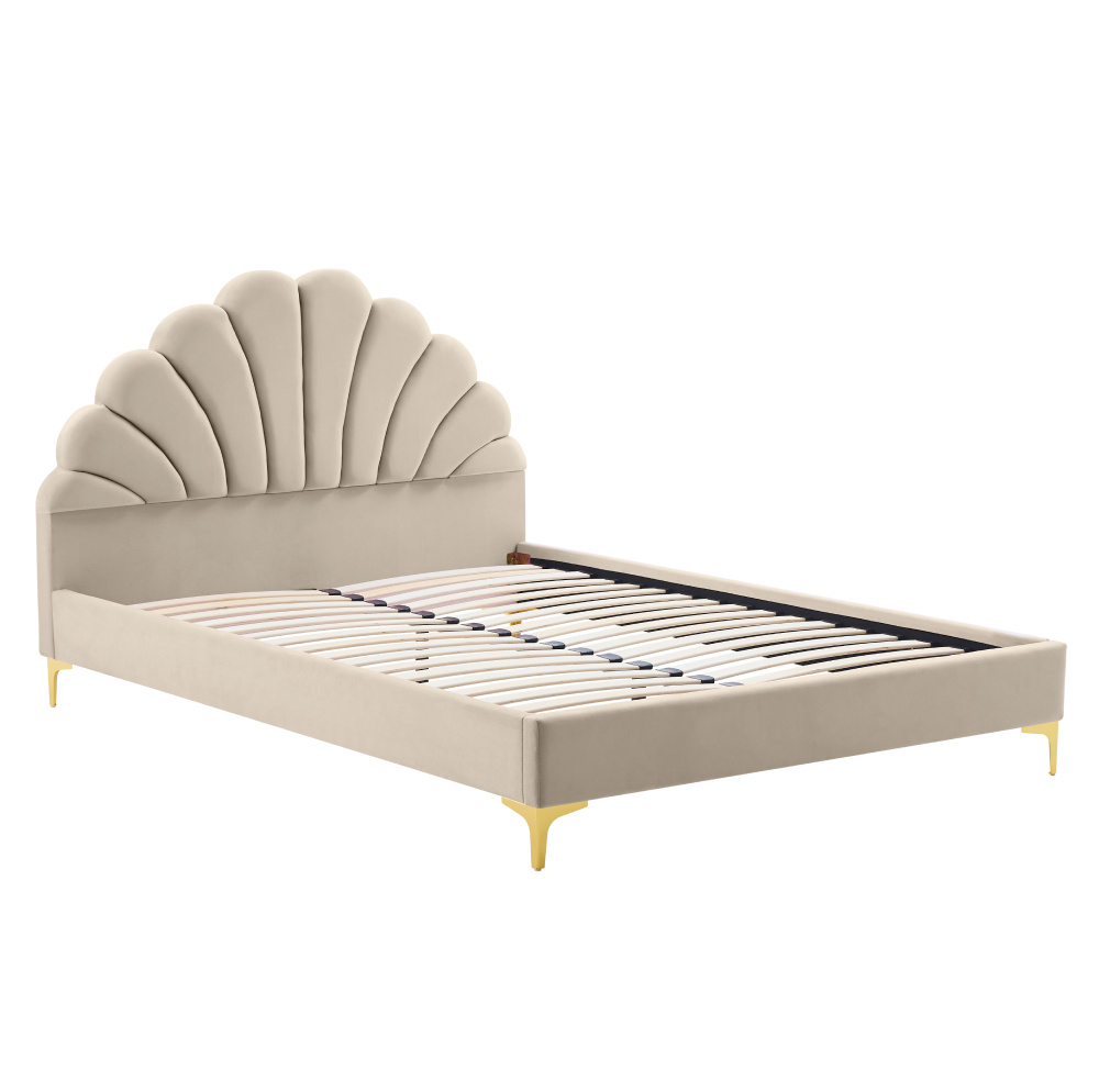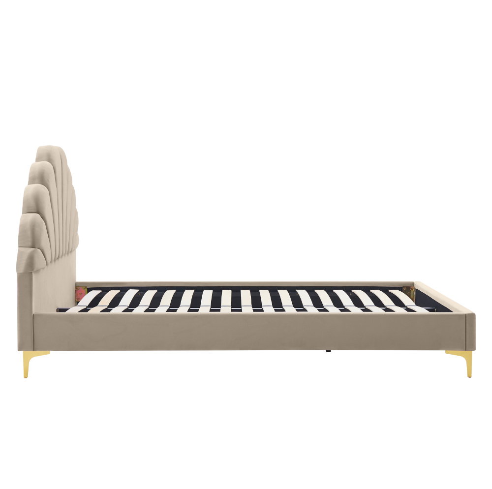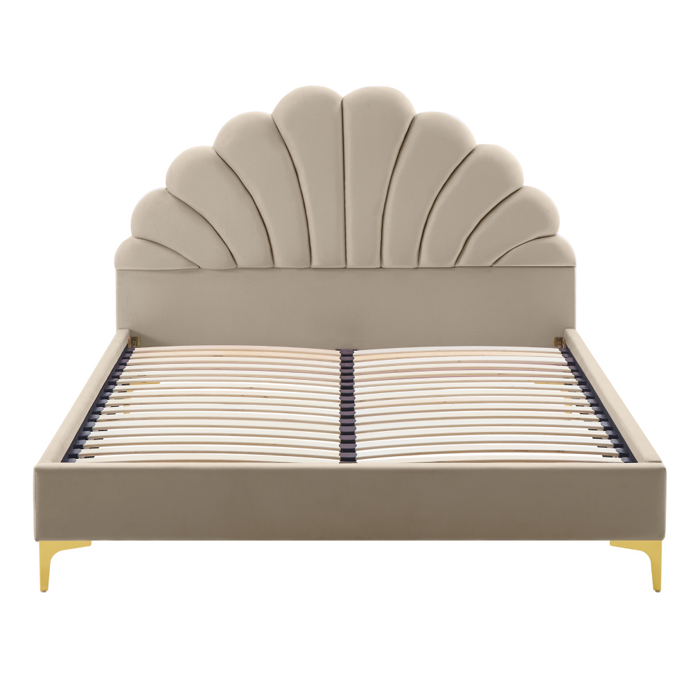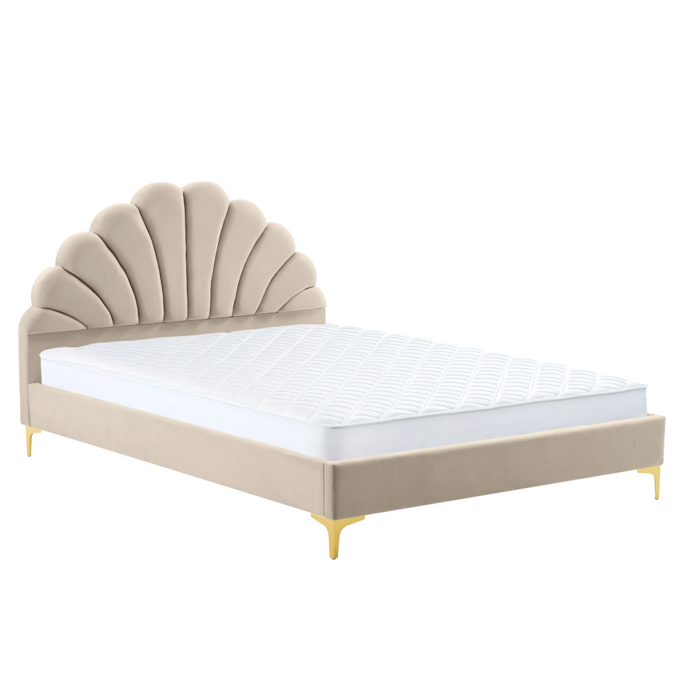 Materiál: Velvet látka/MDF/dřevotříska Oděruodolnost textilie podle testu Martindale: 25 000-30 000 oděrů Barva: béžová Rozměry (ŠxHxV): 171x214x110 cm Plocha na spaní (ŠxD): 160x200 cm Výška po rošt: 27 cm Výška bočnice: 30 cm Nosnost na osobu: 110 kg Dekorativní prošívané čelo ve tvaru mušle Na nožičkách Materiál nožiček: kov Barva nožiček: zlatá Výška nožiček: 13 cm Dodávána s lamelovým roštem Prostor mezi lamelami: 5,5 cm Dodávána bez matrace Doporučujeme zakoupit matraci z naší nabídky Zapuštění matrace: 3 cm Doporučená výška matrace: 20 cm Elegantní Čalouněná Dodáváno v demontu