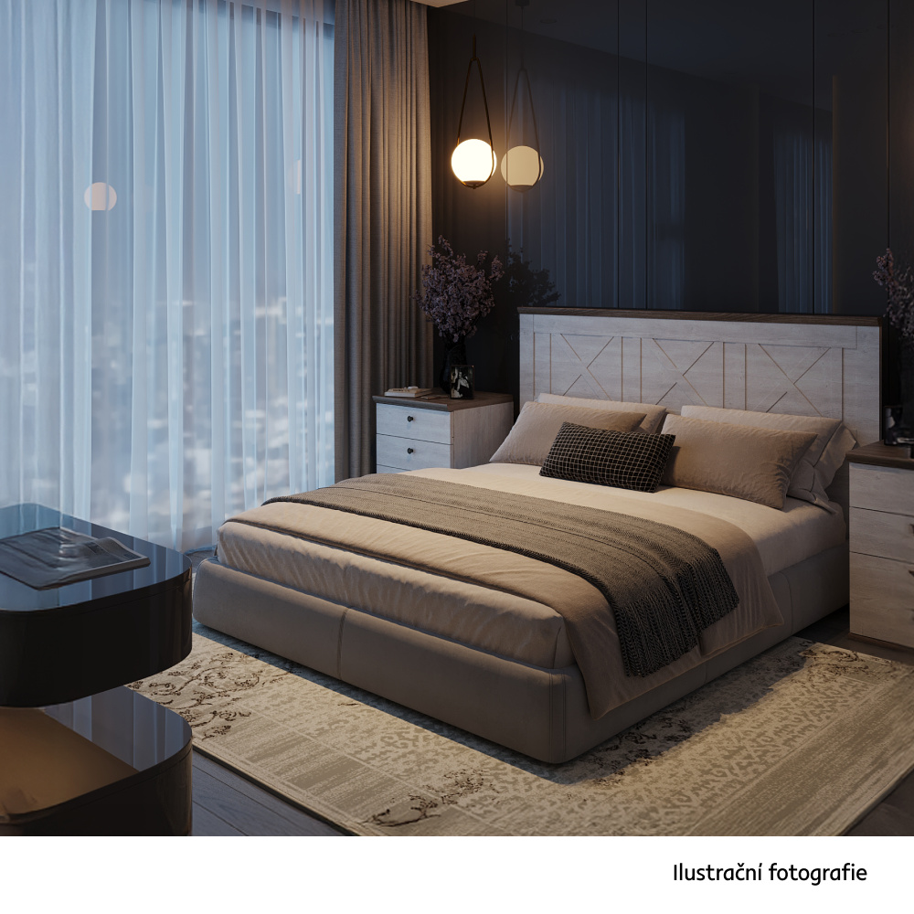 Materiál: laminovaná DTD Barva: borovice canyon/dub sonoma trufel Rozměry (ŠxHxV): 165x204,5x101 cm Plocha na spaní (ŠxD): 160x200 cm Tloušťka materiálu: 1,6 cm Nosnost na osobu: 100 kg Výška po rošt: 19 cm Na nožičkách Výška spodního prostoru od podlahy: 25 cm Dodávána s roštem Dodávána bez matrace Možnost dokoupit matraci z naší nabídky Doporučená výška matrace: 16 cm Moderní design Dodáváno v demontu