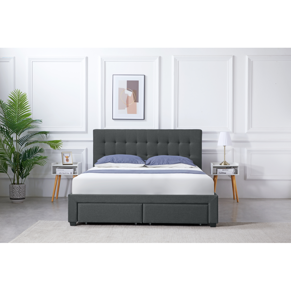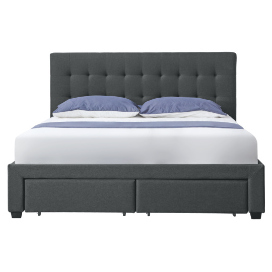 Materiál: melaminová MDF/velvet látka Oděruodolnost textilie podle testu Martindale: 80 000 oděrů Barva: šedá Rozměry (ŠxHxV): 190x218x105 cm Plocha na spaní (ŠxD): 180x200 cm Výška po rošt: 31,2 cm Výška bočnice: 30 cm Zapuštění matrace: 3,8 cm Nosnost na osobu: 250 kg Na nožičkách Výška nožiček: 5 cm Barva nožiček: černé Materiál nožiček: borové dřevo S úložným prostorem Čtyři šuplíky Vnitřní rozměry menší zásuvky (ŠxHxV): 58x48x14 cm Vnitřní rozměry větší zásuvky (ŠxHxV): 74x48x14 cm Nosnost šuplíku: 8 kg Dodávána s lamelovým roštem Prostor mezi lamelami: 5 cm Dodávána bez matrace Doporučujeme zakoupit matraci z naší nabídky Doporučená Max. výška matrace: 20 cm S vysokým čelem Dekorativní prošívané čelo Elegantní Čalouněná Dodáváno v demontu