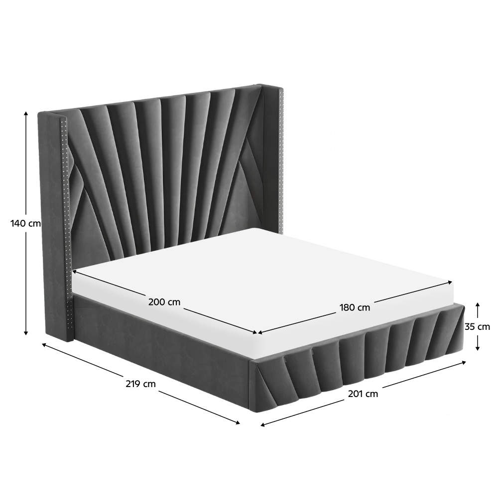 Materiál: látka Velvet/MDF/překližka/kov Oděruodolnost textilie podle testu Martindale: 25 000 - 30 000 oděrů Barva: tmavě šedá Rozměry (ŠxHxV): 201x219x140 cm Plocha na spaní (ŠxD): 180x200 cm Výška po rošt: 33 cm Nosnost na lůžko: 110 kg S vysokým čelem Výška bočnice: 35 cm Výška zadní čelo: 140 cm Prošívané čelo S úložným prostorem Dodáváno s vyklápěcím lamelovým roštem Prostor mezi lamelami: 5,5 cm Plynové písty Dodáváno bez matrace Možnost zakoupit matrace z naší nabídky Doporučená výška matrace: 20 cm Zapuštění matrace: 2 cm Elegantní design Dodáváno v demontu