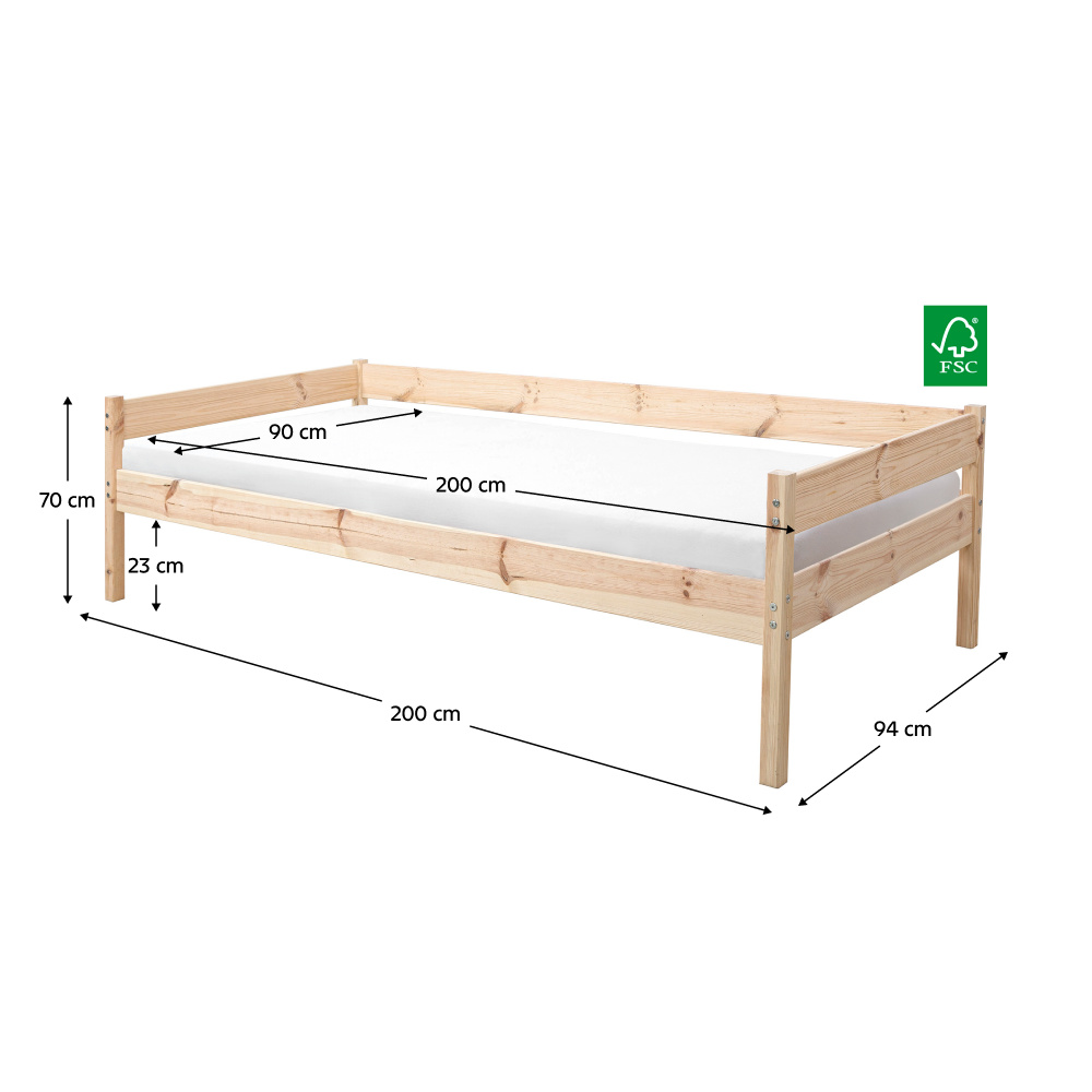 Materiál: smrk Barva: přírodní Rozměry (ŠxHxV): 208x94x70 cm Plocha na spaní (ŠxH): 90x200 cm Tloušťka materiálu: 1,8 cm Nosnost na lůžko: 100 kg Na nožičkách Výška nožiček: 23 cm Tloušťka materiálu nohy: 4 cm Dodávána s laťkovým roštem Počet latí: 15 Dodáváno bez matrace Možnost zakoupit matrace z naší nabídky Doporučená výška matrace: 15 cm Postel je dodávána bez úložného boxu a přistýlky Možnost zakoupit úložný box a přistýlku BENY z naší nabídky Bez povrchové úpravy Kvalitní slovenský výrobek Dodáváno v demontu