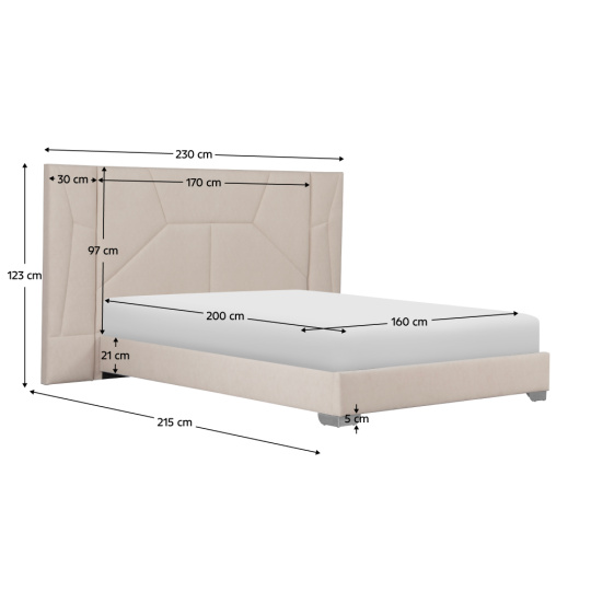 Materiál: látka Velvet/MDF/překližka Oděruodolnost textilie podle testu Martindale: 25 000 oděrů Barva: béžová Rozměry (ŠxHxV): 230x215x123 cm Plocha na spaní (ŠxD): 160x200 cm Výška roštu od země: 21,5 cm Výška bočnice: 21 cm S vysokým čelem Prošívané čelo Výška zadní čelo: 123 cm Tloušťka zadní čelo: 6 cm Tloušťka přední čelo: 5 cm Na nožičkách Materiál nožiček: kov Barva nožiček: stříbrná Výška nožiček: 5 cm Dodáváno s LED osvětlením Počet barev LED osvětlení: 16 S dálkovým ovladačem Dodáváno s lamelovým roštem Prostor mezi lamelami: 5,5 cm Dodáváno bez matrace Možnost zakoupit matrace z naší nabídky Doporučená výška matrace: 15-25 cm Zapuštění matrace: 4,5 cm Elegantní design Nosnost na lůžko: 150 kg Dodáváno v demontu