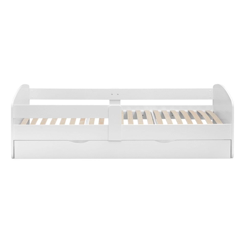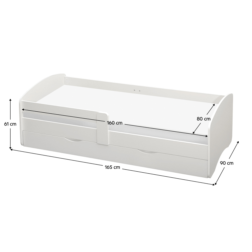 Materiál: laminovaná DTD Barva: bílá Rozměry (ŠxHxV): 165x90x61 cm Rozměry spaní (ŠxD): 80x160 cm Tloušťka materiálu: 1,8 cm Možnost namontovat zábranu na levou nebo pravou stranu Moderní a praktická S úložným prostorem Úložný prostor na kolečkách Dva šuplíky Hmotnost: 47 kg Nosnost: 60 kg Dodávána s lamelovým roštem Dodávána bez matrace Doporučená výška matrace: 15 cm Zapuštění matrace: 5,2 cm Dodávána v demontu