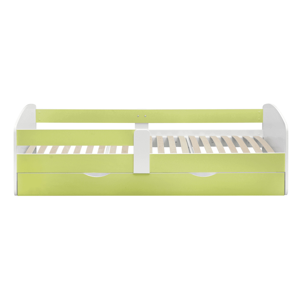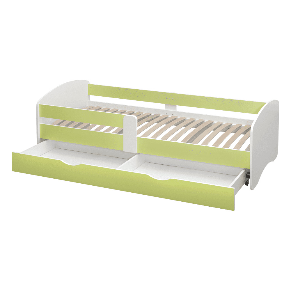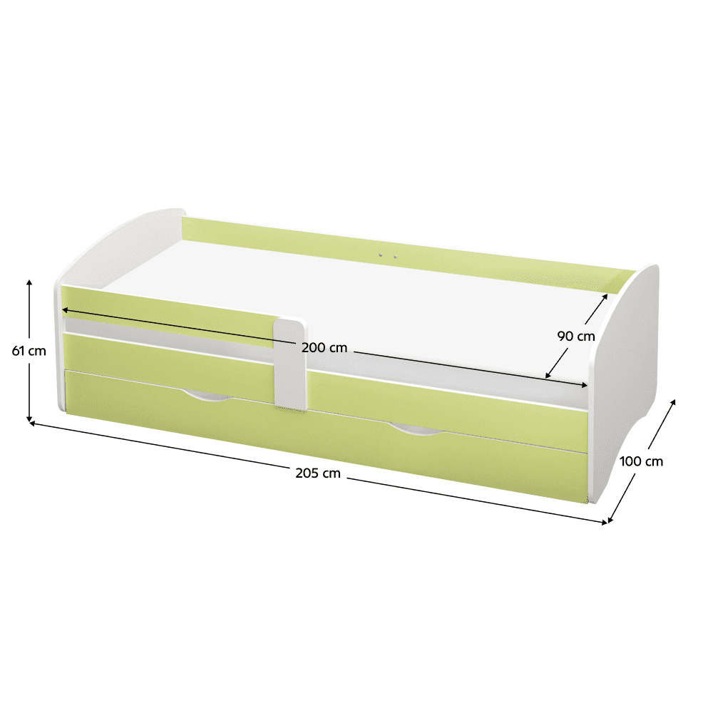 Materiál: laminovaná DTD Barva: bílá/zelená Rozměry (ŠxHxV): 205x100x61 cm Rozměry spaní (ŠxD): 90x200 cm Tloušťka materiálu: 1,8 cm Možnost namontovat zábranu na levou nebo pravou stranu Moderní a praktická S úložným prostorem Úložný prostor na kolečkách Dva šuplíky Hmotnost: 55 kg Nosnost: 90 kg Dodávána s lamelovým roštem Dodávána bez matrace Doporučená výška matrace: 15 cm Zapuštění matrace: 5,2 cm Možnost dokoupit matraci z naší nabídky Dodávána v demontu