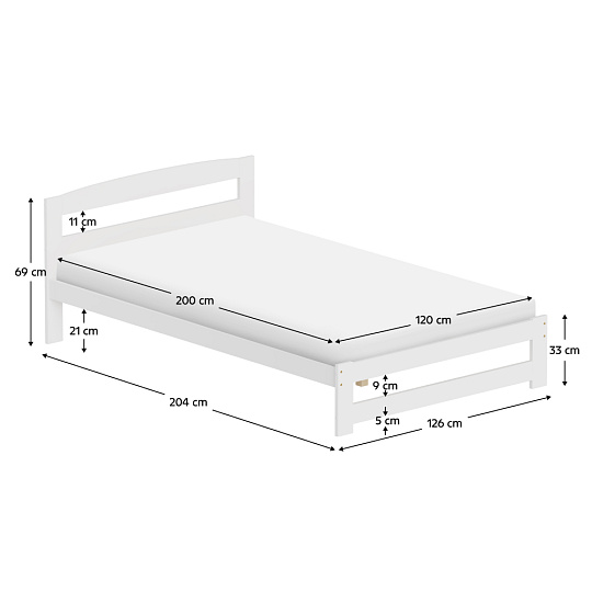Materiál: borové dřevo Barva: bílá Rozměry (ŠxHxV): 126x204x69 cm Plocha na spaní (ŠxD): 120x200 cm Tloušťka materiálu: 2 cm Nosnost na lůžko: 90 kg Výška po rošt: 28 cm Na nožičkách Výška spodního prostoru od podlahy: 21 cm Dodávána s překližkovým rolovaným roštem Dodávána bez matrace Možnost zakoupit matraci z naší nabídky Doporučená minimální výška matrace: 7 cm Zapuštění matrace: 3 cm Jednoduchý design Praktická Dodáváno v demontu