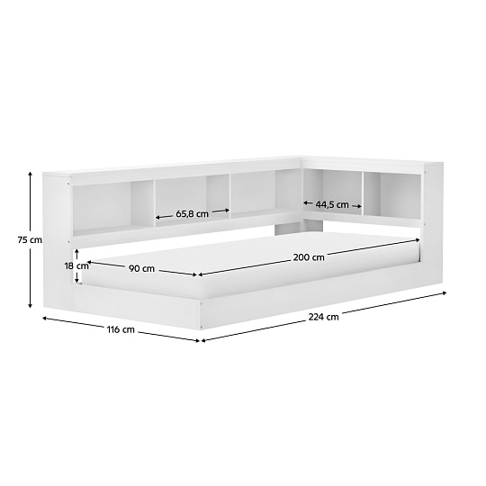 Materiál: borové dřevo Barva: bílá Rozměry (ŠxHxV): 224x116x75 cm Plocha na spaní (ŠxD): 90x200 cm Tloušťka materiálu: 2 cm Nosnost na lůžko: 90 kg Úložný prostor Otevřený odkládací prostor Police Nosnost police: 7 kg Nosnost vrchní desky delší strana: 21 kg Nosnost vrchní desky kratší strana: 14 kg Dodávána s roštem Překližkový rolovaný rošt Dodávána bez matrace Možnost zakoupit matraci z naší nabídky Doporučená minimální výška matrace: 14 cm Zapuštění matrace: 11,5 cm Moderní design Praktická Dodáváno v demontu