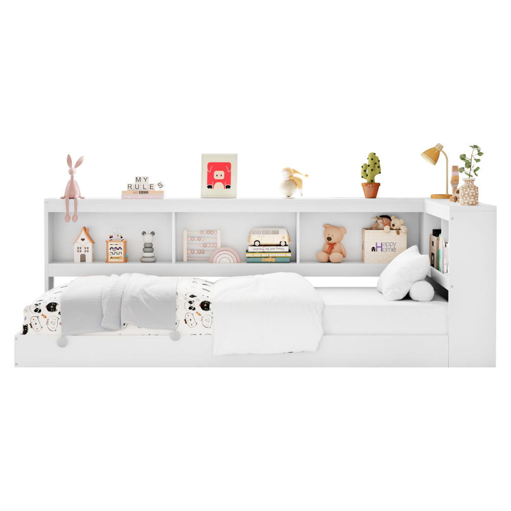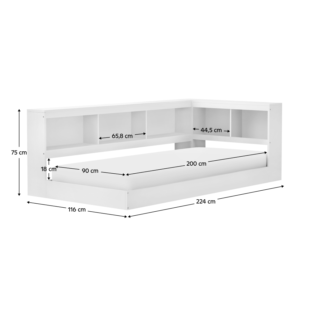 Materiál: borové dřevo Barva: bílá Rozměry (ŠxHxV): 224x116x75 cm Plocha na spaní (ŠxD): 90x200 cm Tloušťka materiálu: 2 cm Nosnost na lůžko: 90 kg Úložný prostor Otevřený odkládací prostor Police Nosnost police: 7 kg Nosnost vrchní desky delší strana: 21 kg Nosnost vrchní desky kratší strana: 14 kg Dodávána s roštem Překližkový rolovaný rošt Dodávána bez matrace Možnost zakoupit matraci z naší nabídky Doporučená minimální výška matrace: 14 cm Zapuštění matrace: 11,5 cm Moderní design Praktická Dodáváno v demontu