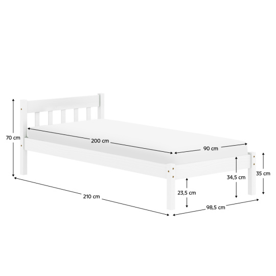 Materiál: masivní borové dřevo Barva: bílá Rozměry (ŠxHxV): 98,5x210x70 cm Plocha na spaní (ŠxD): 90x200 cm Tloušťka materiálu: 2,5 cm Nosnost na lůžko: 110 kg Výška po rošt: 29 cm Výška bočnice: 34,5 cm Na nožičkách Výška nožiček: 35 cm Tloušťka materiálu nohy: 5x5 cm Dodávána s rolovaným roštem Počet lamel: 14 ks Rozestup mezi lamelami: 7,5 cm Tloušťka materiálu lamely: 2 cm Dodáváno bez matrace Možnost zakoupit matrace z naší nabídky Doporučená výška matrace: 14 cm Zapuštění matrace: 6 cm Jednoduchý design Dodáváno v demontu