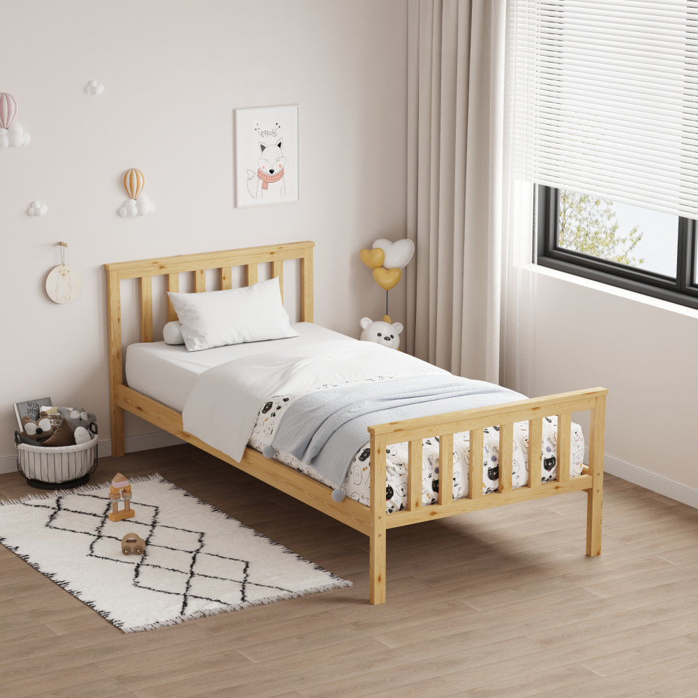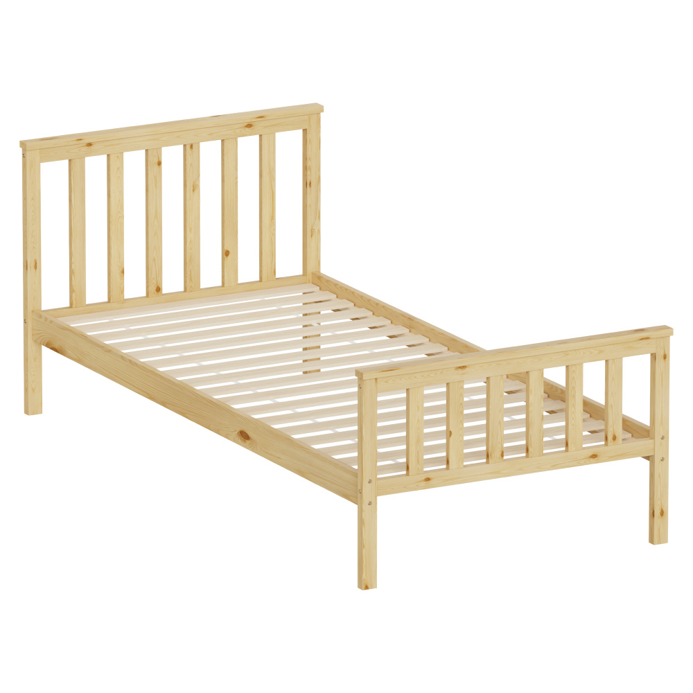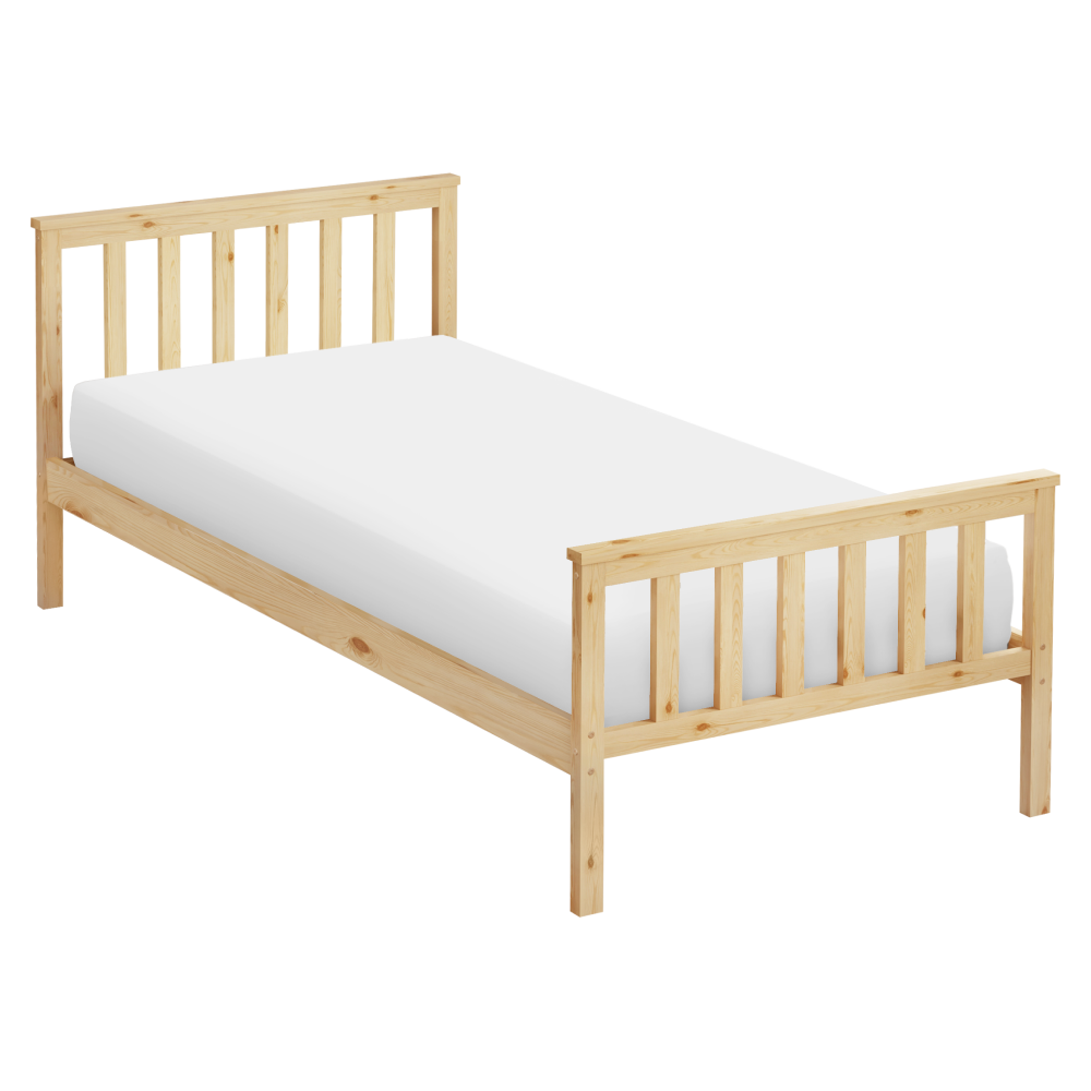Materiál: borové dřevo Barva: přírodní Rozměry (ŠxHxV): 98x207x82 cm Plocha na spaní (ŠxD): 90x200 cm Tloušťka materiálu: 2 cm Nosnost na lůžko: 90 kg Výška po rošt: 26 cm Na nožičkách Dodávána s překližkovým rolovaným roštem Dodávána bez matrace Možnost zakoupit matraci z naší nabídky Doporučená výška matrace: 7 cm Zapuštění matrace: 3 cm Jednoduchý design Praktická Dodáváno v demontu