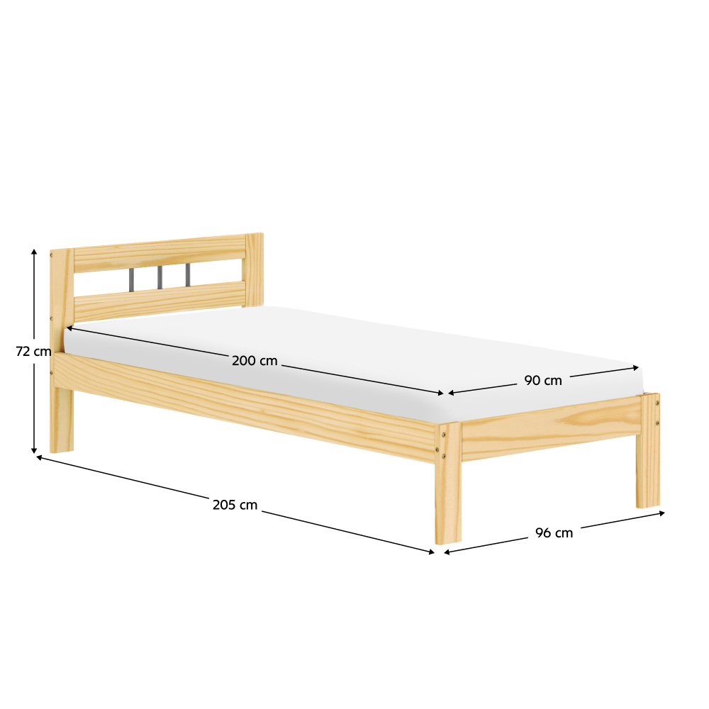 Materiál: masivní borové dřevo Barva: přírodní Rozměry (ŠxHxV): 96x205x72 cm Plocha na spaní (ŠxD): 90x200 cm Tloušťka materiálu: 2,6 cm Nosnost na lůžko: 110 kg Výška po rošt: 28,6 Na nožičkách Výška nožiček: 35 cm Tloušťka materiálu nohy: 2,6 cm Dodávána s rolovaným roštem Počet lamel: 14 ks Rozestup mezi lamelami: 7,5 cm Tloušťka materiálu lamel: 2 cm Dodáváno bez matrace Možnost zakoupit matrace z naší nabídky Doporučená výška matrace: 14 cm Zapuštění matrace: 7,2 cm Jednoduchý design Dodáváno v demontu