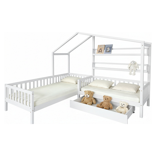 Materiál: masivní borové dřevo/lakovaná MDF Barva: bílá Rozměry (ŠxHxV): 245x210x176 cm Plocha na spaní (ŠxD): 90x200 cm Plocha na spaní (ŠxD): 70x140 cm Výška po rošt: 22 cm Výška nožiček: 20 cm Nosnost na lůžko: 95 kg Pro dvě děti 2x police Rozměry police (ŠxHxV): 136x14x18 cm Nosnost police: 5 kg Úložný prostor Jedna zásuvka Na kolečkách Rozměr zásuvky (ŠxHxV): 126x75x17 cm Nosnost šuplíku: 10 kg Postel ve tvaru domečku Postel ve tvaru písmene L Rohová Dodávána se dvěma překližkovými rolovacími rošty Dodávána bez matrace Možnost zakoupit pružinovou nebo pěnovou matraci z naší nabídky Doporučená maximální výška matrace: 12 cm Zapuštění matrace: 3,7 cm Dodáváno v demontu