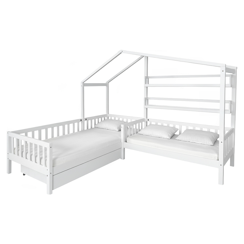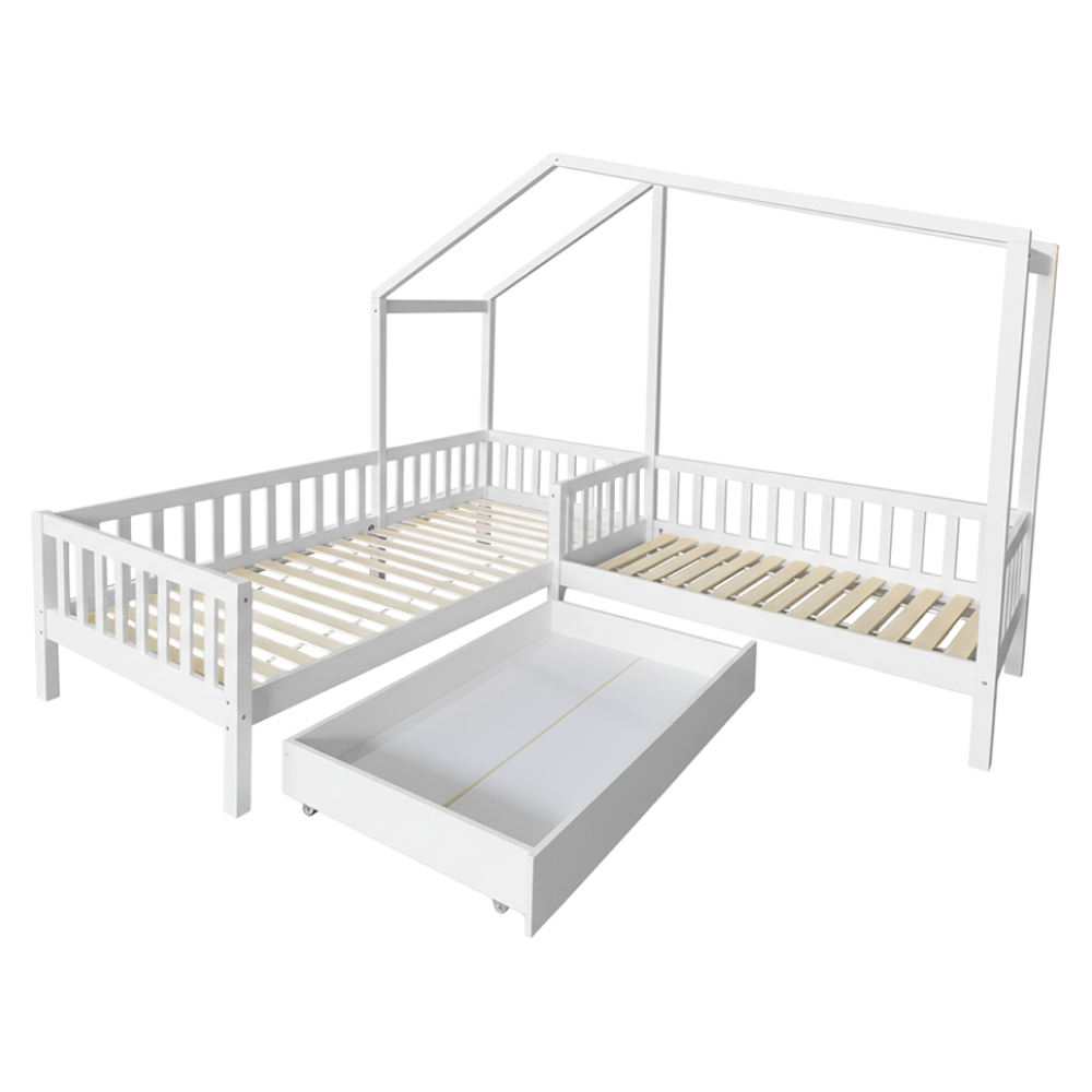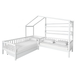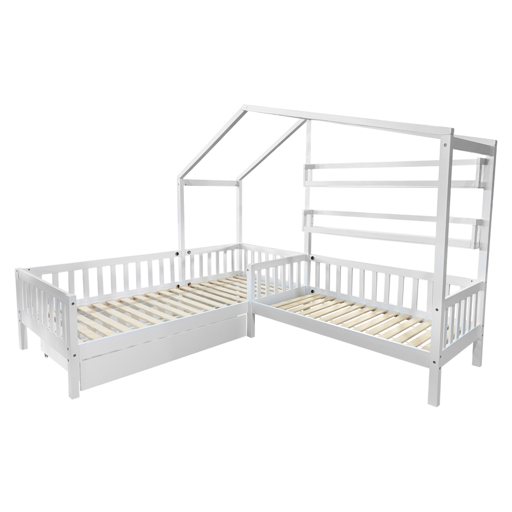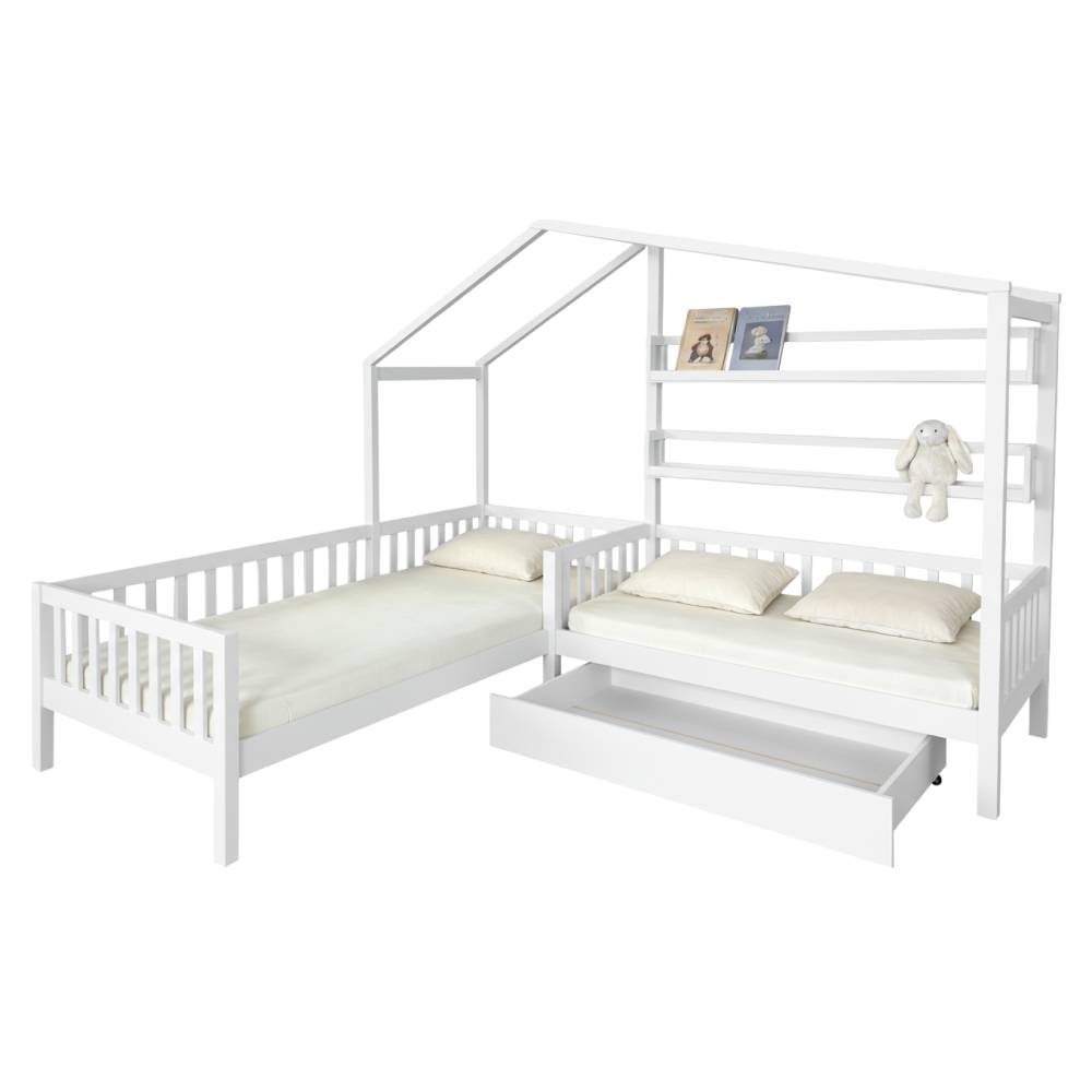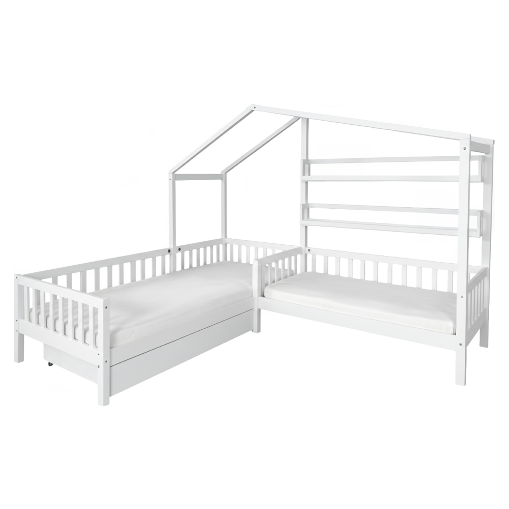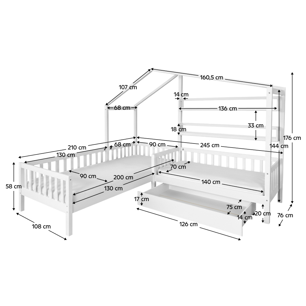 Materiál: masivní borové dřevo/lakovaná MDF Barva: bílá Rozměry (ŠxHxV): 245x210x176 cm Plocha na spaní (ŠxD): 90x200 cm Plocha na spaní (ŠxD): 70x140 cm Výška po rošt: 22 cm Výška nožiček: 20 cm Nosnost na lůžko: 95 kg Pro dvě děti 2x police Rozměry police (ŠxHxV): 136x14x18 cm Nosnost police: 5 kg Úložný prostor Jedna zásuvka Na kolečkách Rozměr zásuvky (ŠxHxV): 126x75x17 cm Nosnost šuplíku: 10 kg Postel ve tvaru domečku Postel ve tvaru písmene L Rohová Dodávána se dvěma překližkovými rolovacími rošty Dodávána bez matrace Možnost zakoupit pružinovou nebo pěnovou matraci z naší nabídky Doporučená maximální výška matrace: 12 cm Zapuštění matrace: 3,7 cm Dodáváno v demontu