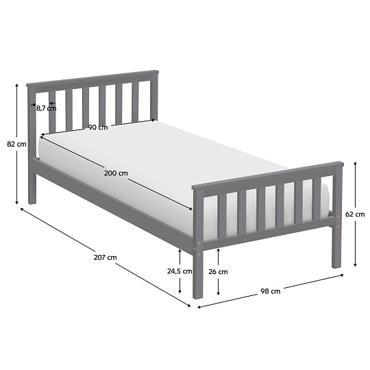 Materiál: borové dřevo Barva: šedá Rozměry (ŠxHxV): 98x207x82 cm Plocha na spaní (ŠxD): 90x200 cm Tloušťka materiálu: 2 cm Nosnost na lůžko: 90 kg Výška po rošt: 26 cm Na nožičkách Dodávána s překližkovým rolovaným roštem Dodávána bez matrace Možnost zakoupit matraci z naší nabídky Doporučená výška matrace: 7 cm Zapuštění matrace: 3 cm Jednoduchý design Praktická Dodáváno v demontu