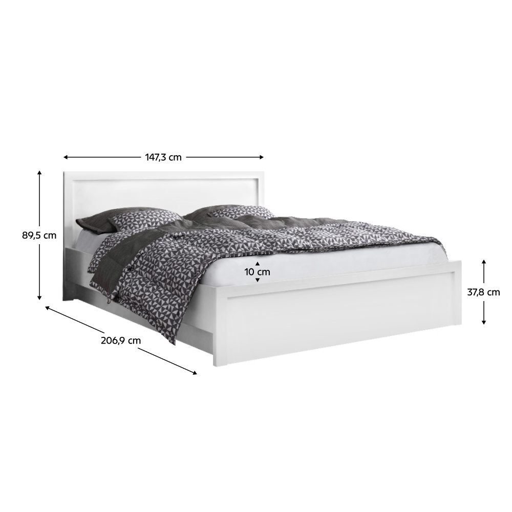 Materiál: DTD laminovaná Barva: bílá Rozměry (ŠxHxV): 147,3x206,9x89,5 cm Tloušťka materiálu: 1,6 cm Plocha na spaní (ŠxD): 140x200 cm Výška spaní: 37,8 cm Nosnost na osobu: 100 kg Doporučená minimální výška matrace: 10 cm Dodáváno bez matrace Doporučujeme zakoupit matraci 140x200 cm Plastové nožičky S úložným prostorem Dodávána s výklopným roštem Kovový rám a dřevěné lamely Moderní design Dodáváno v demontu