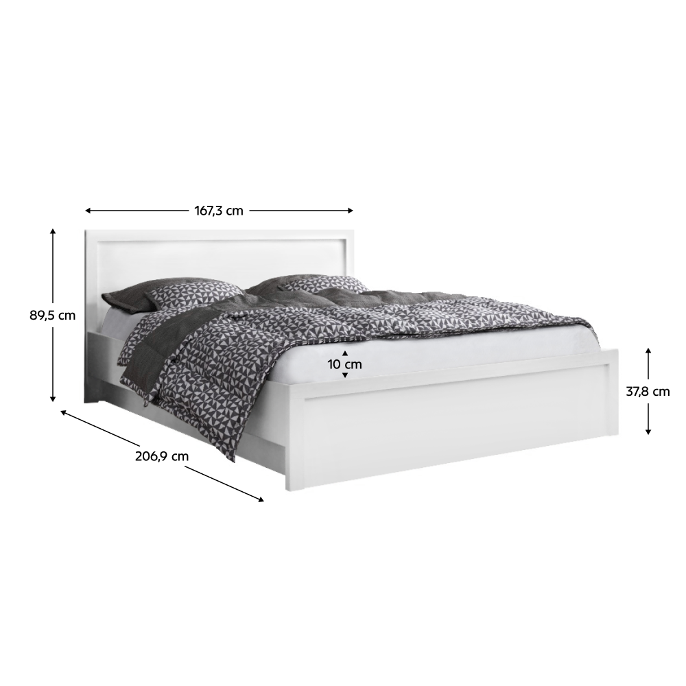 Materiál: DTD laminovaná Barva: bílá Rozměry (ŠxHxV): 167,3x206,9x89,5 cm Tloušťka materiálu: 1,6 cm Plocha na spaní (ŠxD): 160x200 cm Výška spaní: 37,8 cm Nosnost na osobu: 100 kg Doporučená minimální výška matrace: 10 cm Dodáváno bez matrace Možnost dokoupit matraci z naší nabídky Plastové nožičky S úložným prostorem Dodávána s výklopným roštem Kovový rám a dřevěné lamely Moderní design Dodáváno v demontu