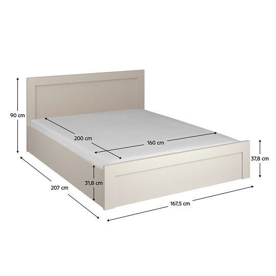 Materiál: laminovaná DTD Barva: kašmír Rozměry (ŠxHxV): 167,5x207x90 cm Tloušťka materiálu DTD: 1,6-3,2 cm Plocha na spaní (ŠxD): 160x200 cm Nosnost na osobu: 90 kg Výška po rošt: 20 cm Dodávána s výklopným roštem Plynové písty Dodáváno bez matrace Možnost dokoupit matraci z naší nabídky Zapuštění matrace: 12 cm Doporučená minimální výška matrace: 13 cm S úložným prostorem Moderní design Dodáváno v demontu
