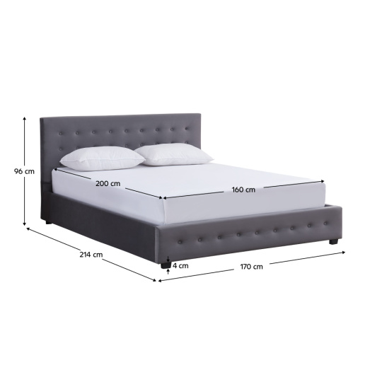 Materiál: Velvet látka/překližka/kov/pěna Oděruodolnost textilie podle testu Martindale: 80 000 oděrů Barva: šedá Rozměry (ŠxHxV): 170x212x96 cm Plocha na spaní (ŠxD): 160x200 cm Výška po rošt: 30 cm Výška bočnice:36 cm Zapuštění matrace: 5 cm Nosnost na osobu: 100 kg Na nožičkách Výška nožiček: 4 cm S úložným prostorem Dodávána s lamelovým roštem Vyklápací rošt Dodávána bez matrace Doporučujeme zakoupit matraci z naší nabídky Doporučená výška matrace: 20 cm Dekorativní prošívané čelo Elegantní Čalouněná Dodáváno v demontu