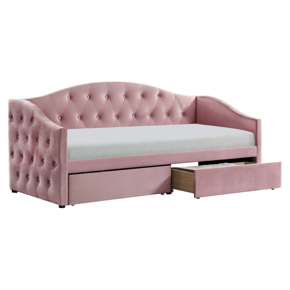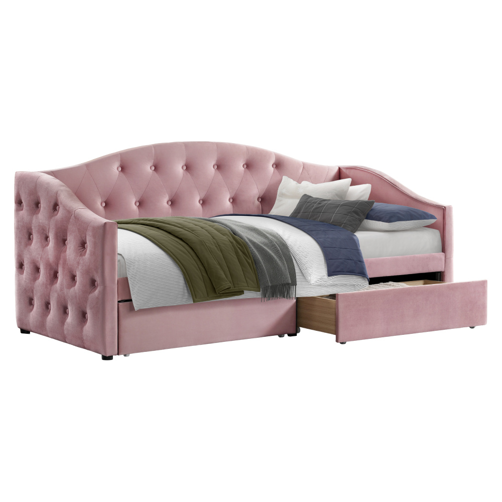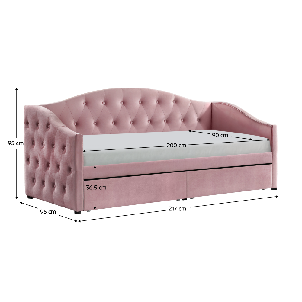 Materiál: látka Velvet/DTD/MDF/laminovaná dýha Oděruodolnost textilie podle testu Martindale: 70 000 oděrů Barva: růžová Rozměry (ŠxHxV): 217x95x95 cm Plocha na spaní (ŠxD): 90x200 cm Čalouněná Úložný prostor Dva šuplíky Vnitřní rozměr šuplíku (ŠxHxV): 37x91,4x14,8 cm Nosnost šuplíku: 5 kg Nosnost na lůžko: 150 kg Dodáváno se 2 laťkovými rošty Výška roštu od země: 36,5 cm Dodáváno bez matrace Doporučujeme zakoupit matraci z naší nabídky Doporučená výška matrace: 18 cm Dekorativní prošité bočnice a čelo postele Na nožičkách Dodáváno v demontu