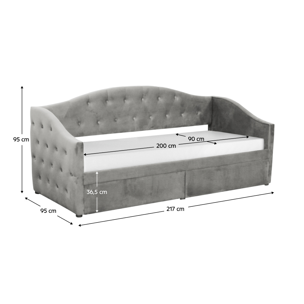 Materiál: látka Velvet/DTD/MDF/laminovaná dýha Oděruodolnost textilie podle testu Martindale: 70 000 oděrů Barva: šedá Rozměry (ŠxHxV): 217x95x95 cm Plocha na spaní (ŠxD): 90x200 cm Čalouněná Úložný prostor Dva šuplíky Vnitřní rozměr šuplíku (ŠxHxV): 37x91,4x14,8 cm Nosnost šuplíku: 5 kg Nosnost na lůžko: 150 kg Dodáváno se 2 laťkovými rošty Výška roštu od země: 36,5 cm Dodáváno bez matrace Doporučujeme zakoupit matraci z naší nabídky Doporučená výška matrace: 18 cm Dekorativní prošité bočnice a čelo postele Na nožičkách Dodáváno v demontu