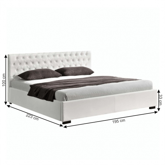 Postel DORLEN 2 NEW s prošívaným čelem, úložným prostorem a výklopným lamelovým roštem. Barevné provedení bílá ekokůže. Oderuodolnosť textílie podľa testu Martindale: 100 000 oderov Rozměry (ŠxHxV): 195x223x100 cm Rozměry plocha na spaní (ŠxD): 183x200 cm Nosnost: 110 kg Doporučujeme zakoupit matrac s rozměrem 183x200 cm. Dodávané bez matrace.