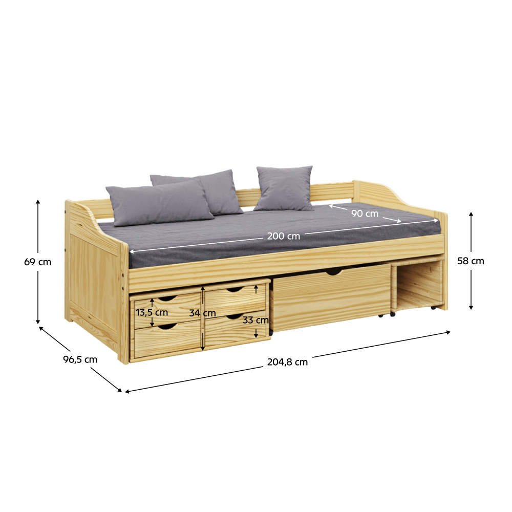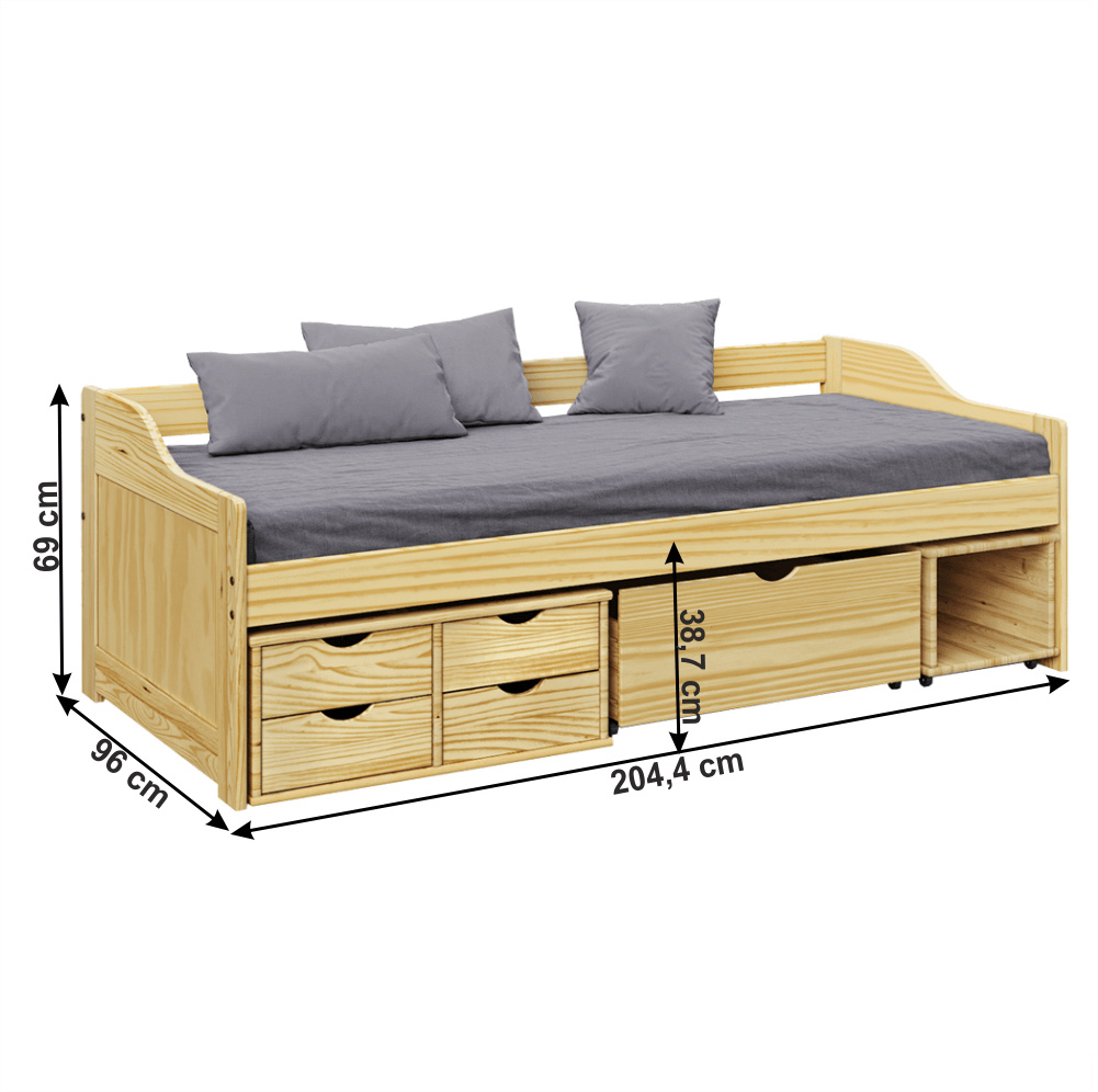 Materiál: borové dřevo Barva: přírodní s kresbou dřeva Rozměry (ŠxHxV): 204,8x96,5x69 cm Rozměry lůžka: 90x200 cm Nosnost na každé lůžko: 120 kg Výška po rošt: 38,7 cm Dodáváno s latkovým roštem Čtyři malé šuplíky Box se šuplíkem Velký šuplík Otevřený box na kolečkách Úložný prostor Dodáváno bez matrací Doporučujeme zakoupit matrace z naší nabídky Dodáváno v demontu