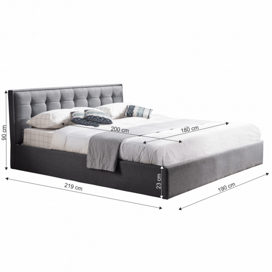 Materiál: látka Oděruodolnost textilie podle testu Martindale: 100 000 oděrek Barva: šedá Rozměry (ŠxHxV): 190x219x90 Plocha na spaní (ŠxH): 180x200 cm Výška po rošt: 23 cm Zapuštění roštu: 4 cm Dodávané s lamelovým roštem Nosnost na jedno lůžko: 110 kg úložný prostor prošívané čelo Dodávané bez matrace Možnost zakoupit matrace z naší nabídky Dodávané v demont
