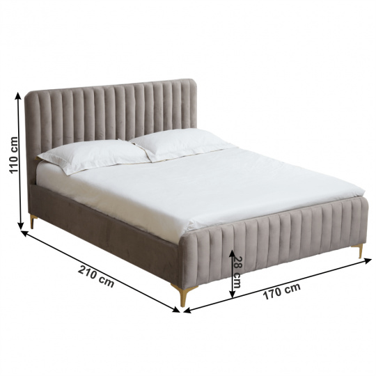 Materiál čalounění: Velvet látka Barva čalounění: šedohnědá Taupe Materiál nohy: kov chrom Barva nohy: gold zlatý matný Rozměry (ŠxHxV): 170x217x110 cm Plocha na spaní (ŠxH): 160x200 cm Výška nožiček: 12,5 cm Výška po rošt: 28 cm Dodávané s lamelovým roštem Nosnost na jedno lůžko: 110 kg kovové nohy Dekorativní prošívané čela Dodávané bez matrace Možnost zakoupit matrace z naší nabídky K posteli je třeba zakoupit matraci min. s výškou 20 cm Dodávané v demontu