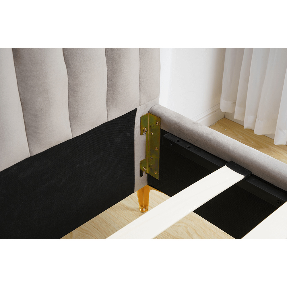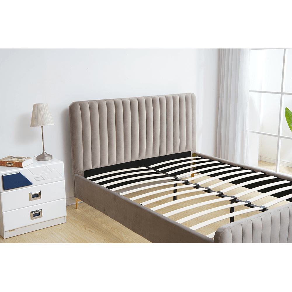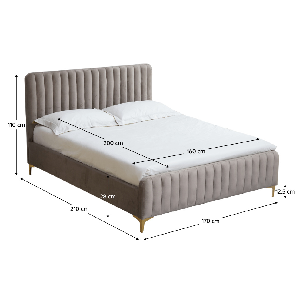 Materiál čalounění: Velvet látka Barva čalounění: šedohnědá Taupe Materiál nohy: kov chrom Barva nohy: gold zlatý Rozměry (ŠxHxV): 170x217x110 cm Plocha na spaní (ŠxH): 160x200 cm Výška nožiček: 12,5 cm Výška po rošt: 28 cm Dodávané s lamelovým roštem Nosnost na jedno lůžko: 110 kg kovové nohy Dekorativní prošívané čela Dodávané bez matrace Možnost zakoupit matrace z naší nabídky K posteli je třeba zakoupit matraci min. s výškou 20 cm Dodávané v demontu