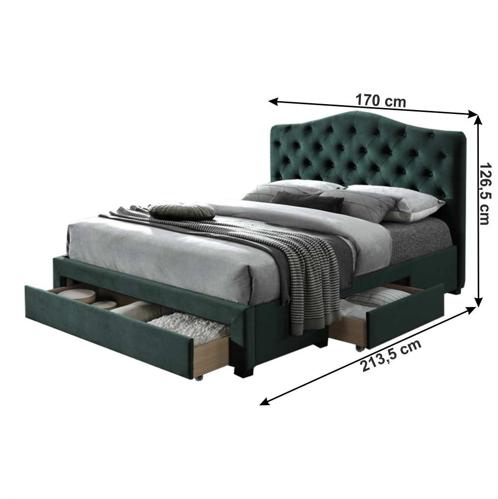 Materiál: Velvet látka Oděruodolnost textilie podle testu Martindale: 80 000 oděrek Barva: smaragdová Rozměry (ŠxHxV): 170x213,5x126,5cm Plocha na spaní (ŠxH): 160x200 cm Dodávané s lamelovým roštem Výška po rošt: 31 cm Nosnost na jedno lůžko: 110 kg S úložným prostorem 3 šuplíky Dekorativní prošívané čelo Dodávané bez matrace Možnost zakoupit matrace z naší nabídky ve stylu Glamour Dodávané v demontu
