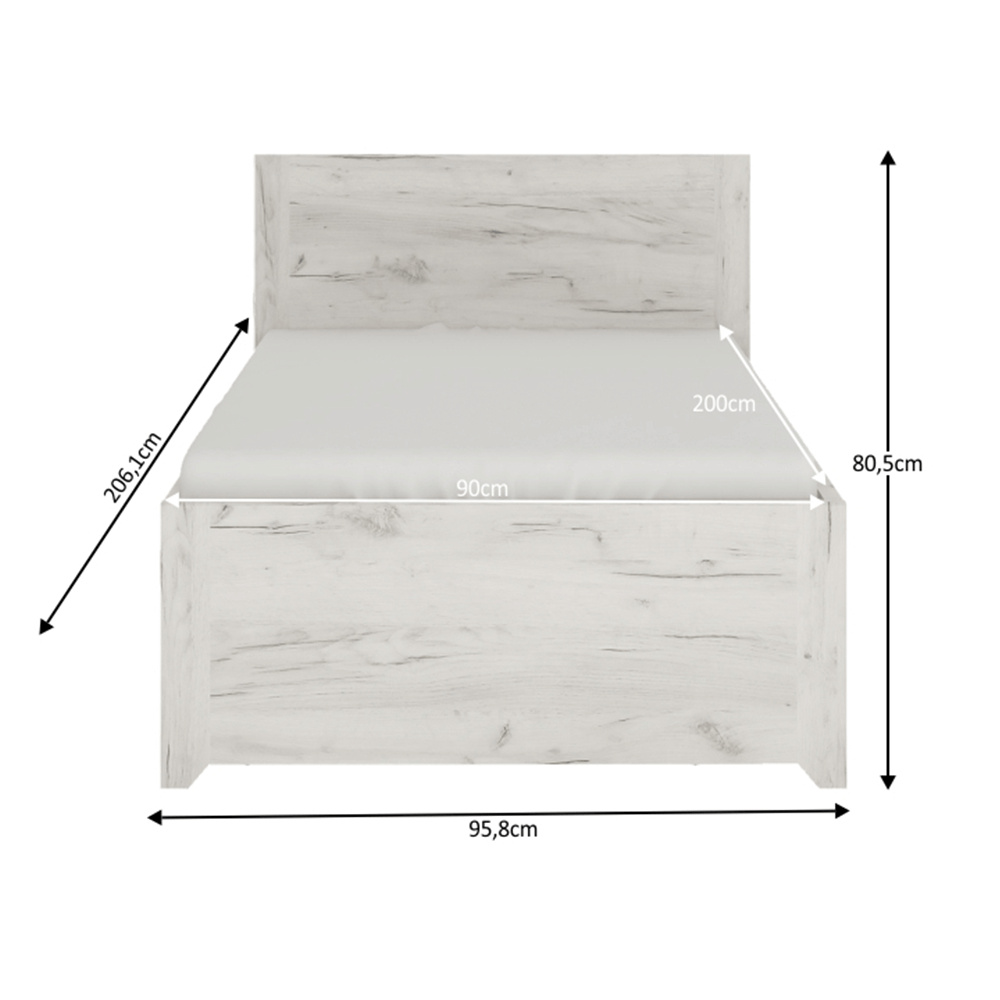 Postel TYP 90 ze sektorové sestavy ANGEL, 90x200, Materiál: laminovaná DTD Barva: bílá craft Rozměry (ŠxHxV): 95,8x206,1x80,5 cm Tloušťka materiálu: 16-28 mm Výška spodního prostoru od podlahy: 2,5 cm Nosnost: 90 kg Dodávané s úložným prostorem, bez matrace a roštu Doporučujeme zakoupit matraci s minimální výškou15 cm Dodávané v demontu
