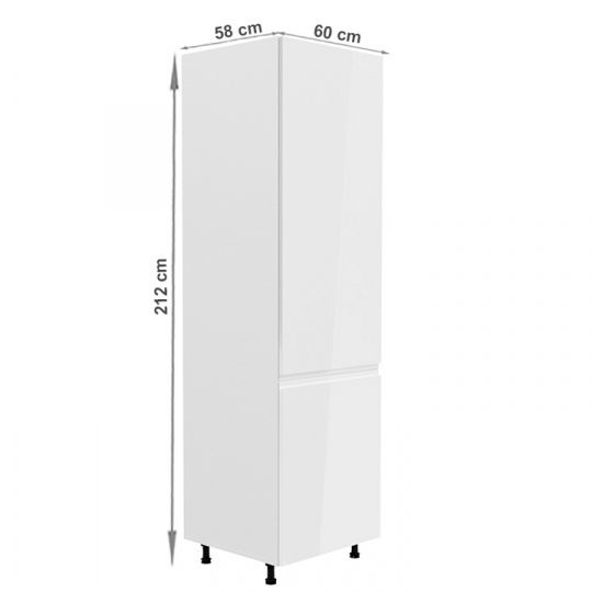 Skříňka na lednici, Aurora D60ZL Provedení: DTD laminové / MDF Barva: bílá / bílá extra vysoký lesk Rozměry (ŠxHxV): 60x58x212 cm Horní dvířka: 130x59,6 cm Dolní dvířka: 71,3x59,6 cm Tloušťka materiálu: 15 mm Vnitřní rozměry na chladničku (ŠxHxV): 57x56x199 cm Systém tichého zavírání dvířek Pracovní deska není součástí skříněk. Je možné s