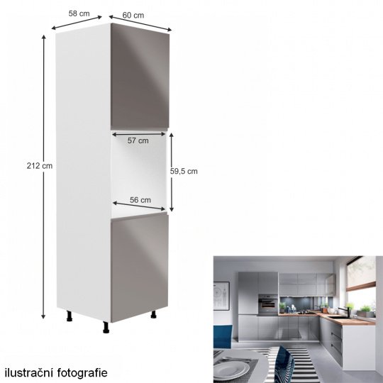 Skříňka na lednici, Aurora D60ZL Provedení: DTD laminové / MDF Barva: bílá / šedá extra vysoký lesk Rozměry (ŠxHxV): 60x58x212 cm Horní dvířka: 130x59,6 cm Dolní dvířka: 71,3x59,6 cm Tloušťka materiálu: 15 mm Vnitřní rozměry na chladničku (ŠxHxV): 57x56x199 cm Systém tichého zavírání dvířek Pracovní deska není součástí skříněk. Je možné s
