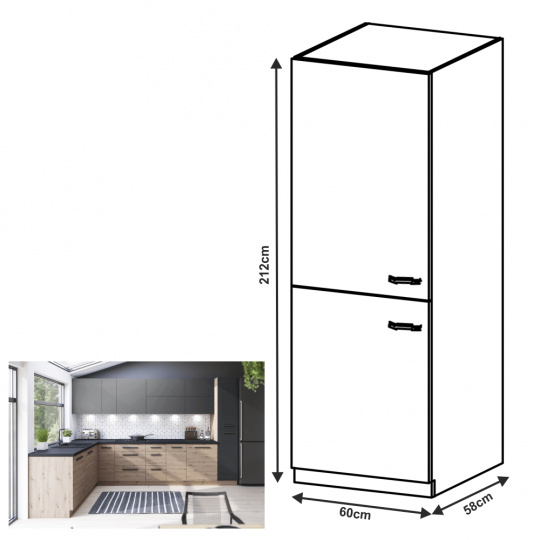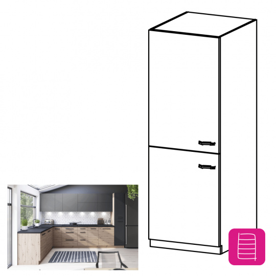 Materiál: DTD laminovaná Barva: dub artisan Rozměry (ŠxHxV): 60x58x212 cm Potravinová Tloušťka materiálu dvířka (dub artisan): 1,5 cm Tloušťka materiálu dvířka (šedá MDF): 1,8 cm S policemi Univerzální provedení Možnost volby otevírání PUSH OPEN Možnost volby otevírání úchytkami Bez spodní lišty Dodáváno v demontu Cena sektorových skříněk je uváděna bez pracovní desky a spodní lišty. Cena za pracovní desku dub artisan je 1.690 Kč / bm - tloušťka 38 mm, cena za pracovní desku černý vulkán je 1.990 Kč / bm - tloušťka 38 mm. Možnost dokoupení spodní lišty dub artisan v rozměru 1 m za cenu 280 Kč nebo v rozměru 2 m za cenu 560 Kč a ukončení na sokl o hloubce 47 cm nebo 58 cm za 140 Kč. Ke každé dolní skříňce je nutné doobjednat 2 ks úchytů na sokl cena 30 Kč / 2 ks. U skříněk D60S3 a D40S3 je třeba si vybrat skříňku s úchytkou nebo systémem Push Open.